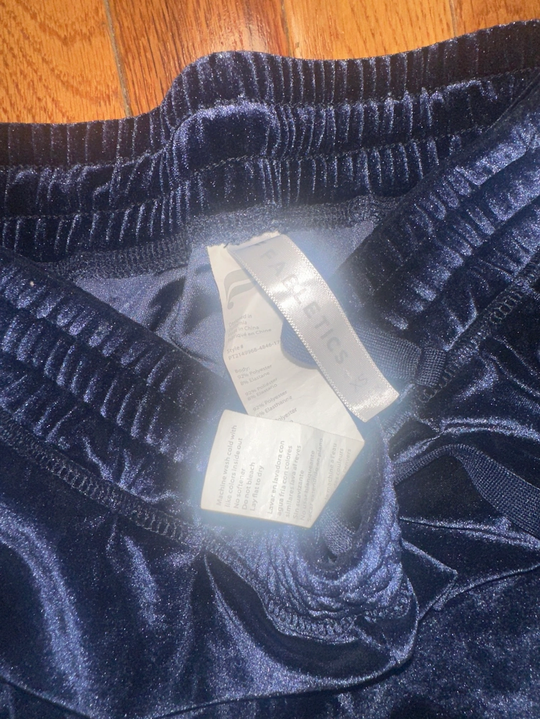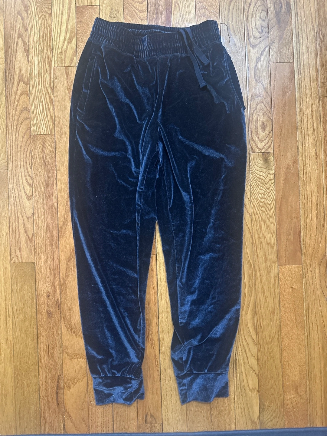 Dark-colored velvet joggers. Elastic waistband with drawstring. Side pockets. Cuffed bottoms. Soft material. Good condition.