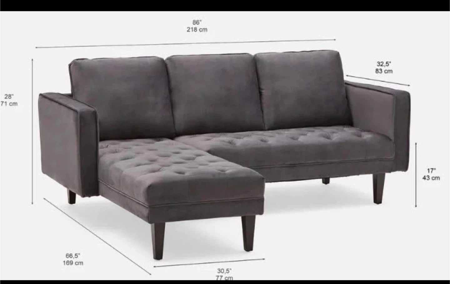 Dimensions: 86" (218 cm) wide, 32.5" (83 cm) deep, 28" (71 cm) high.