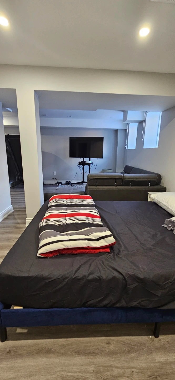 A stylish blue upholstered bed frame featuring a plush headboard. It's designed for a queen-sized mattress. Simple to assemble and provides a sturdy foundation for your bed.