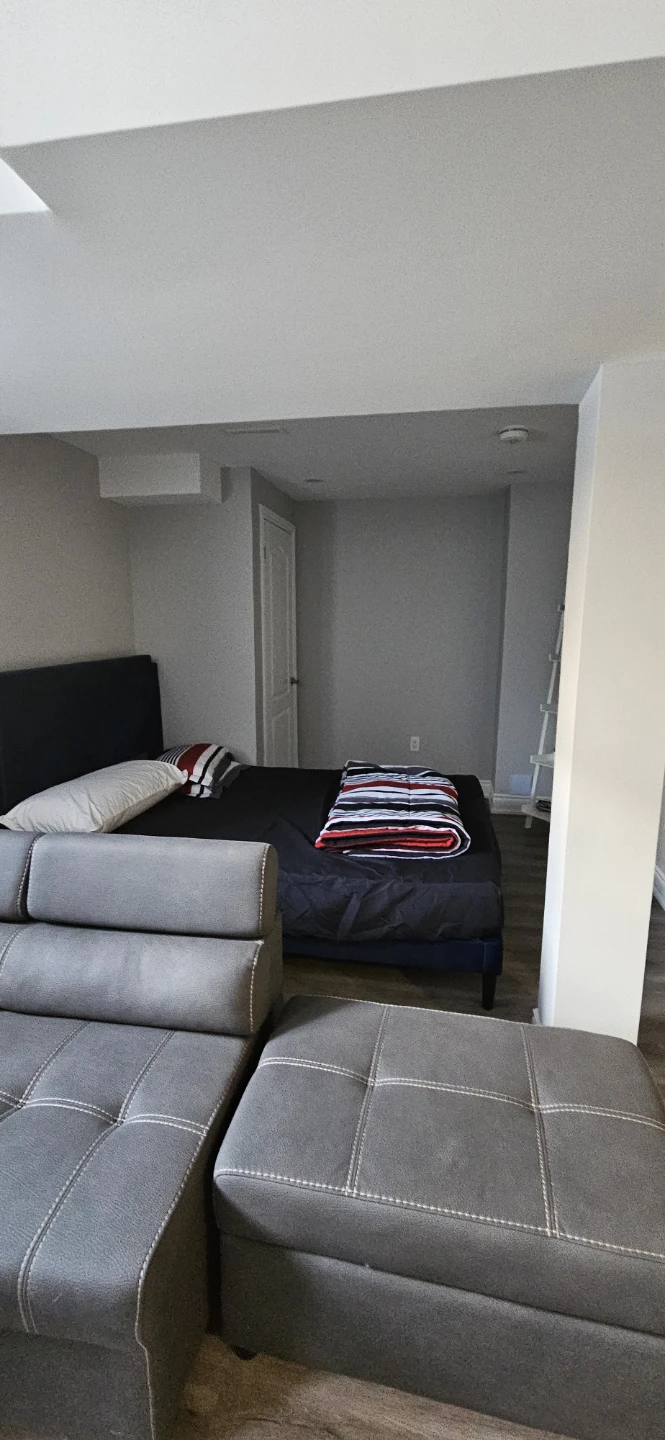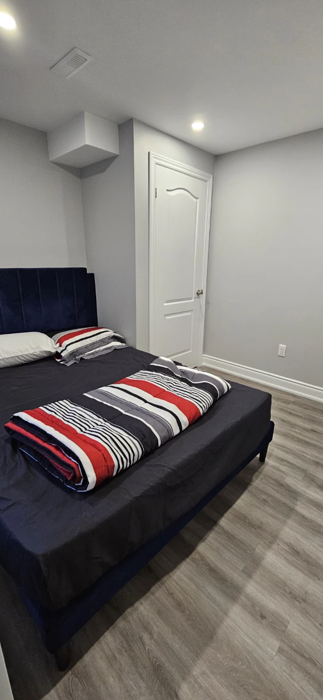 A stylish blue upholstered bed frame featuring a plush headboard. It's designed for a queen-sized mattress. Simple to assemble and provides a sturdy foundation for your bed.