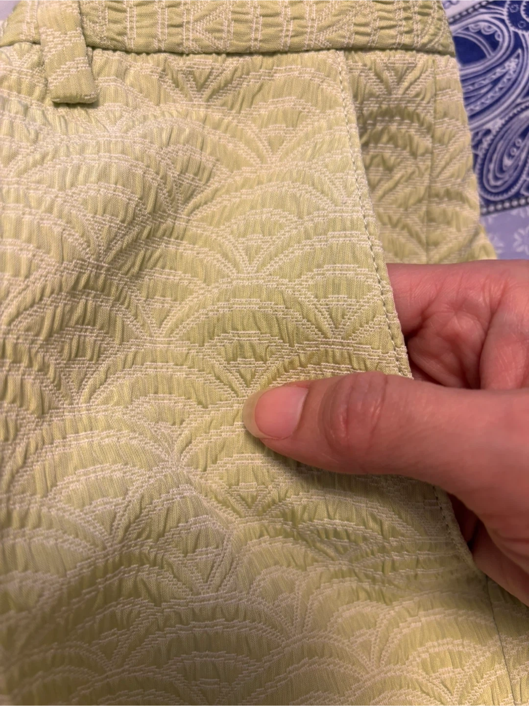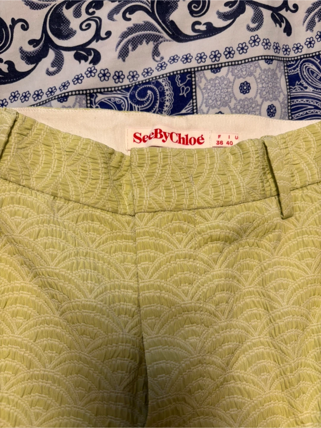 These are a pair of See by Chloé nice trousers in a light green colour. The material is 78% polyester and 22% acrylic, giving them a unique textured look. They're in great condition