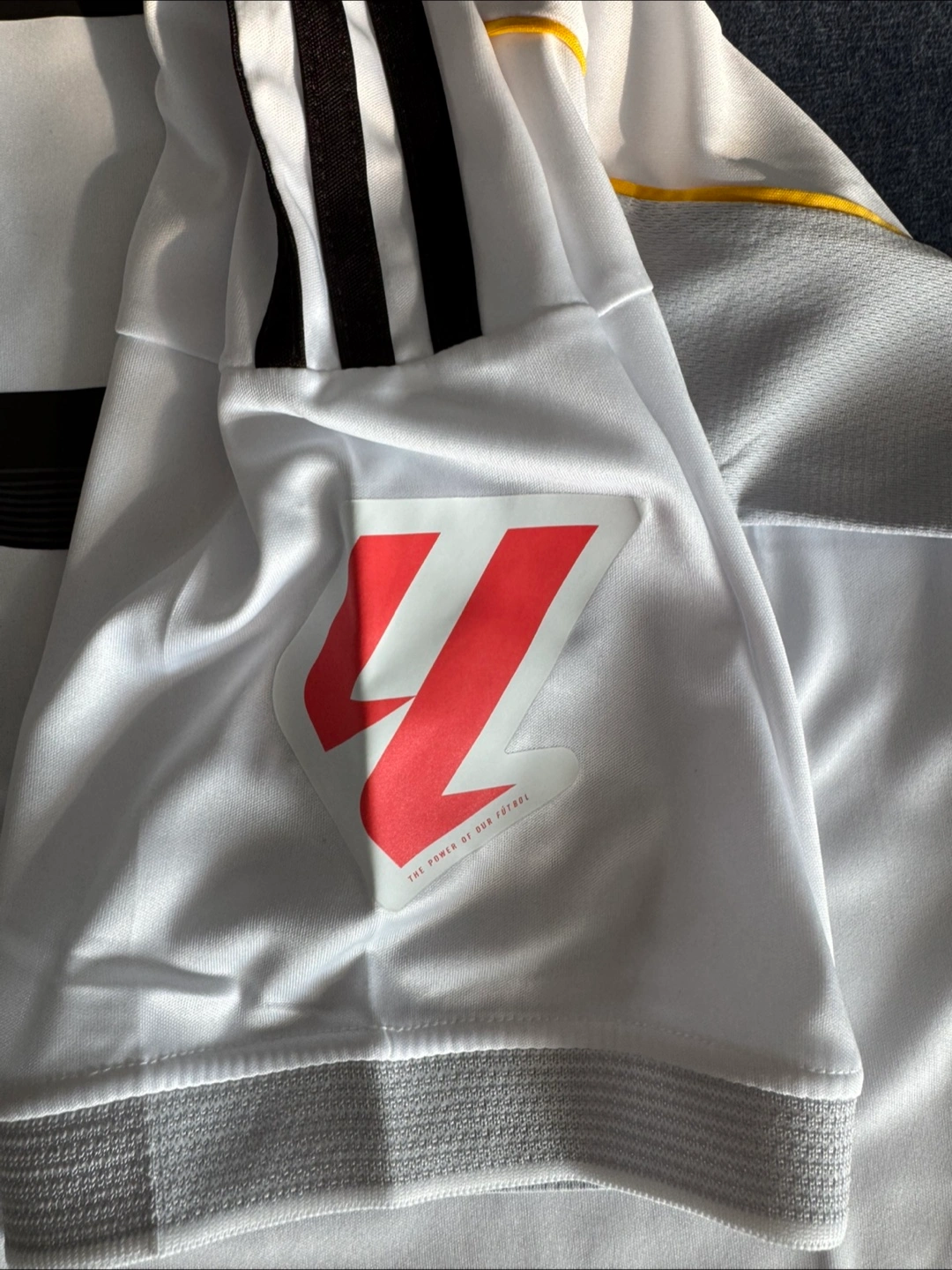 Selling a Real Madrid jersey with Mbappe's name and number on the back! It's an Adidas slim fit, size M. The jersey features the Emirates Fly Better logo on the front and the HP logo on the sleeve. A great piece for any Real Madrid fan!