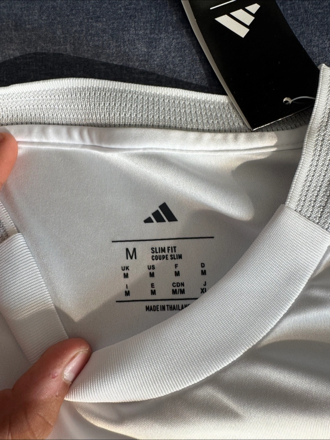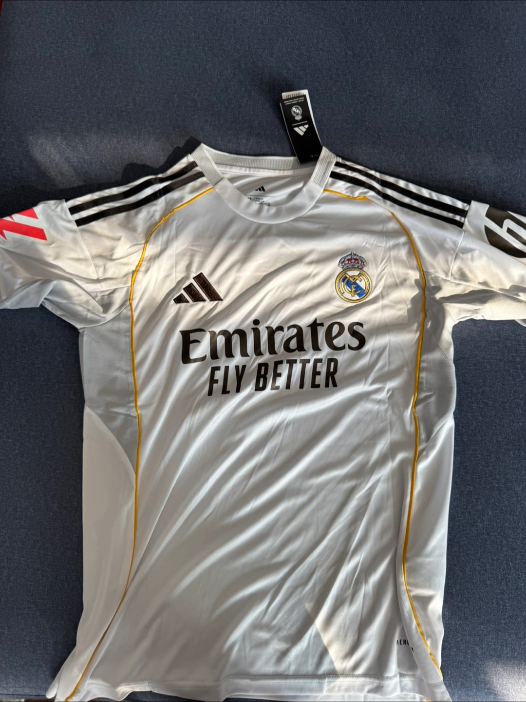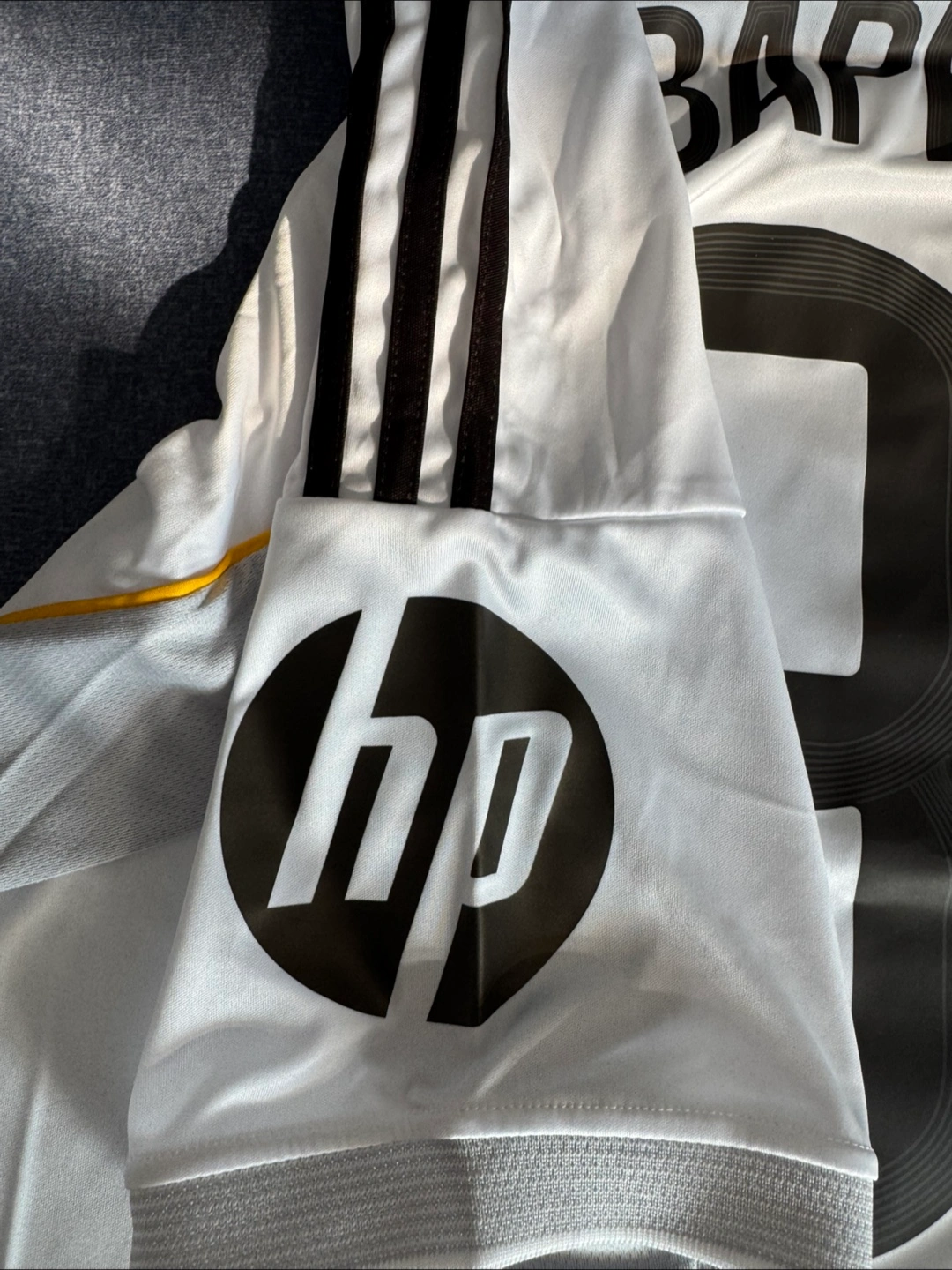 Selling a Real Madrid jersey with Mbappe's name and number on the back! It's an Adidas slim fit, size M. The jersey features the Emirates Fly Better logo on the front and the HP logo on the sleeve. A great piece for any Real Madrid fan!