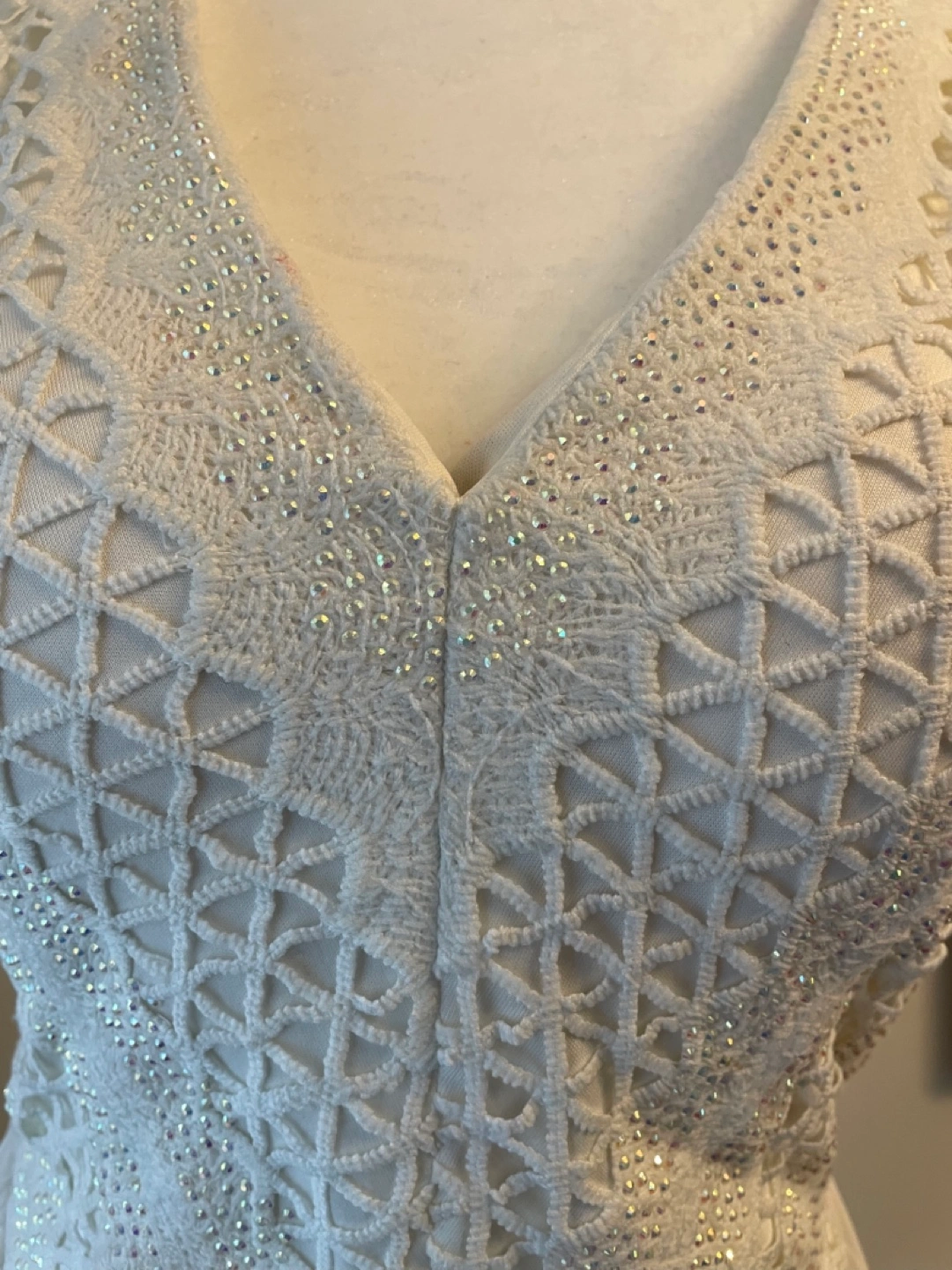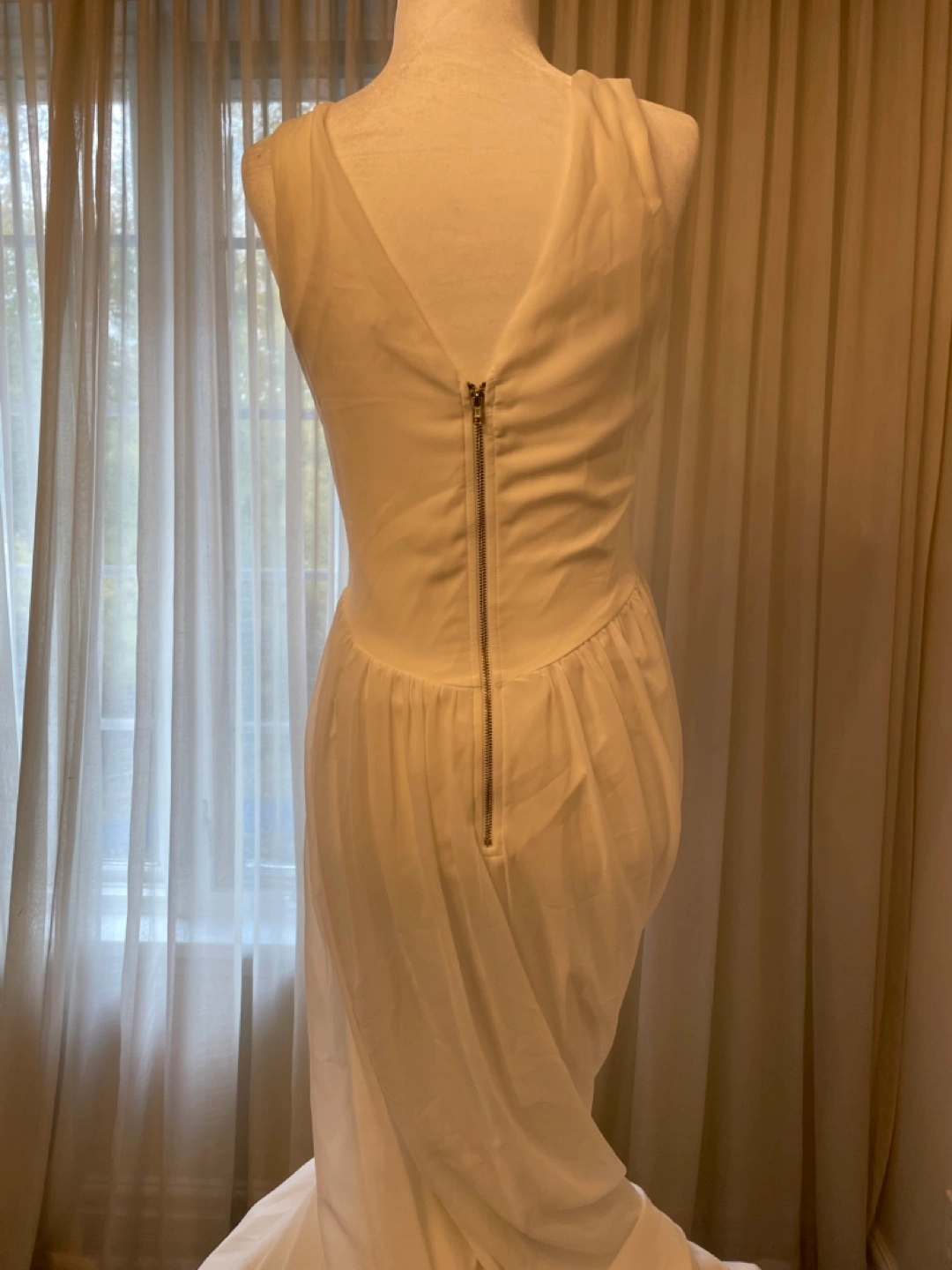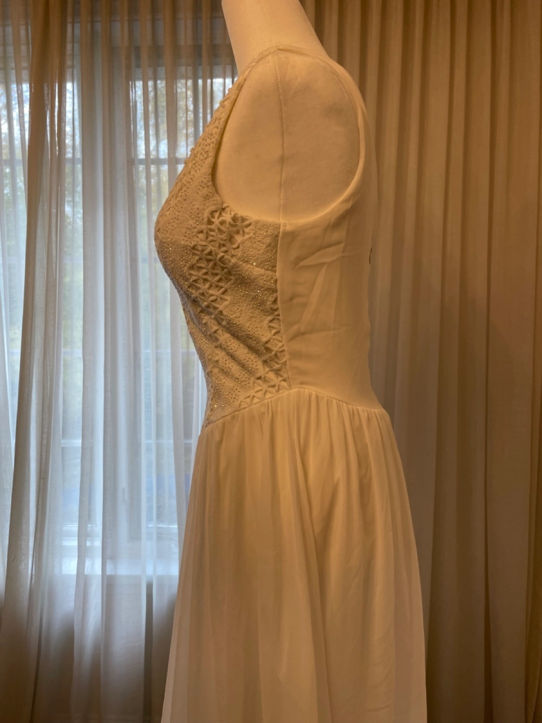Beautiful white maxi dress. Features a V-neck, sleeveless design, and intricate beaded detailing. Back zipper closure. Flowy, sheer fabric. Perfect for a special occasion.