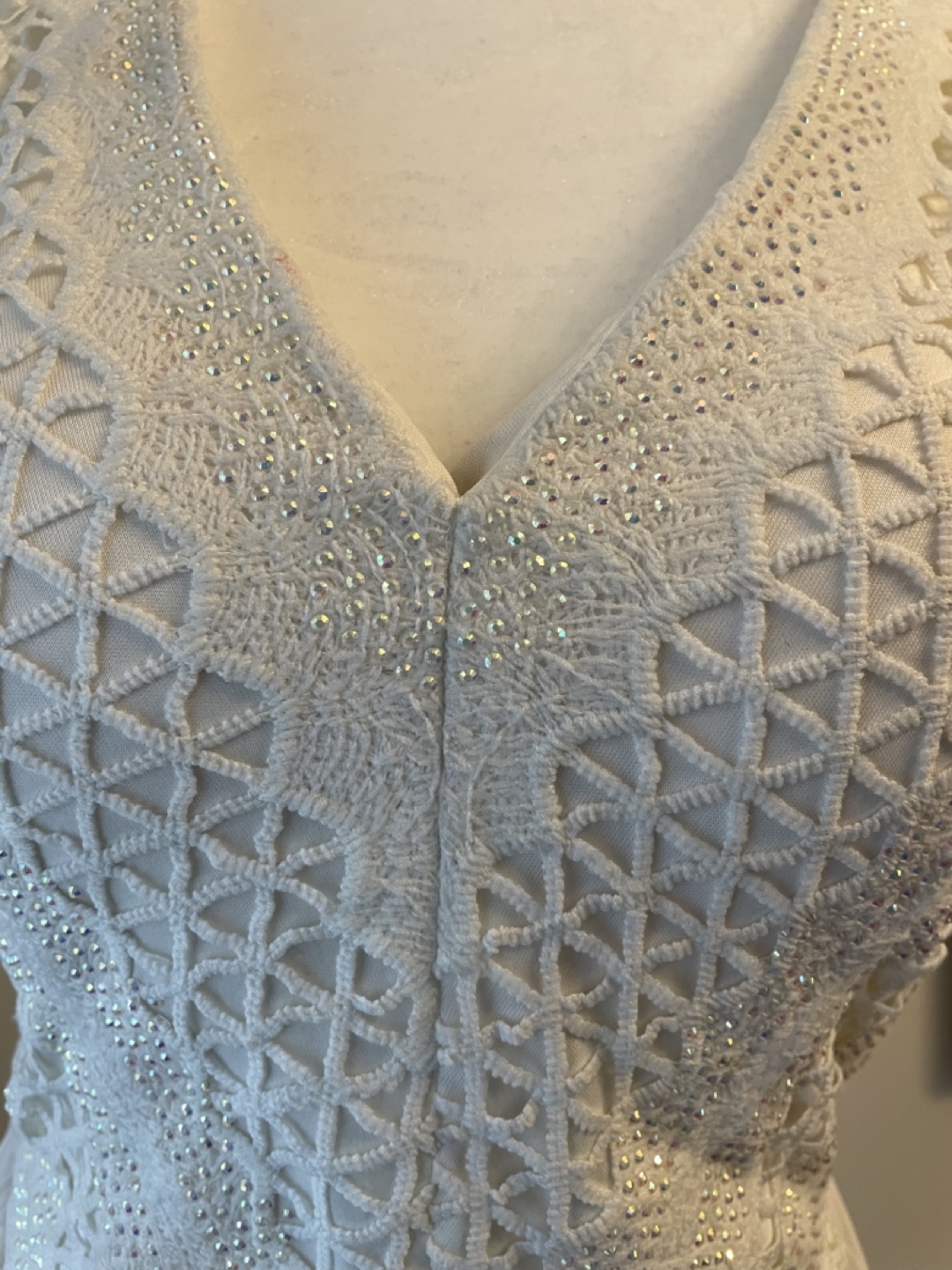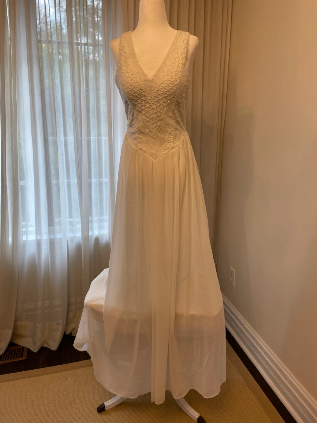 Beautiful white maxi dress. Features a V-neck, sleeveless design, and intricate beaded detailing. Back zipper closure. Flowy, sheer fabric. Perfect for a special occasion.