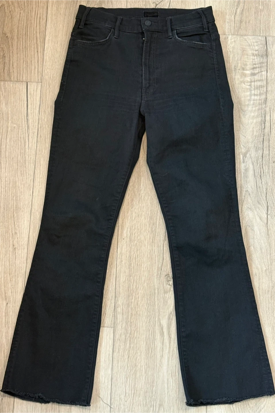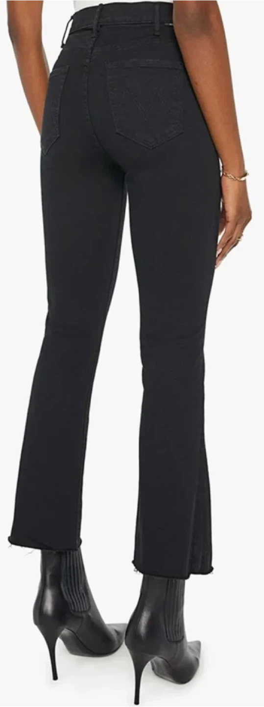 MOTHER The Hustler Ankle Jeans in black. Size 26. These jeans have a high rise and a slight flare at the ankle. They're made with a cotton blend for comfort.