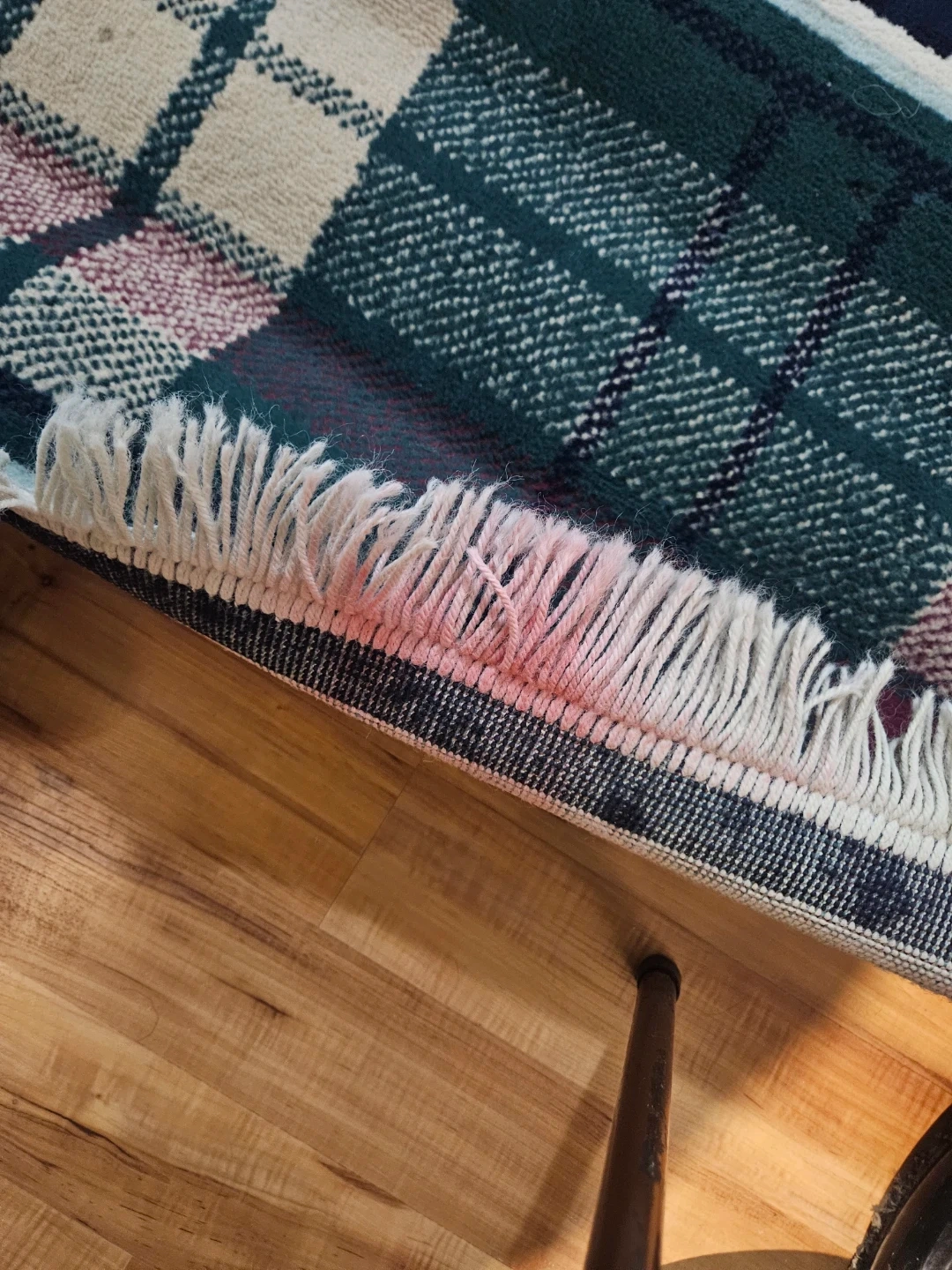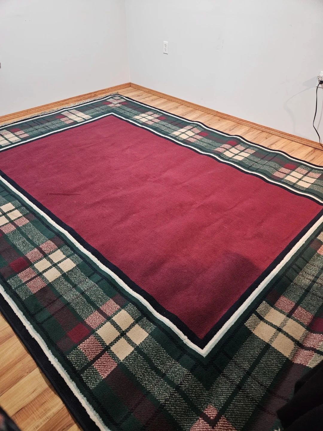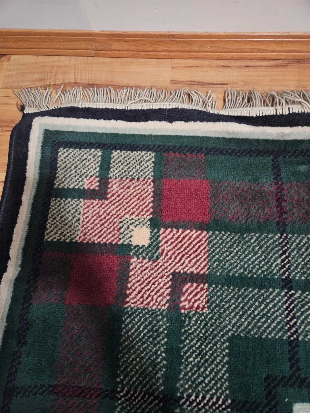 Decorative rug with a classic plaid pattern in green, burgundy, and cream.