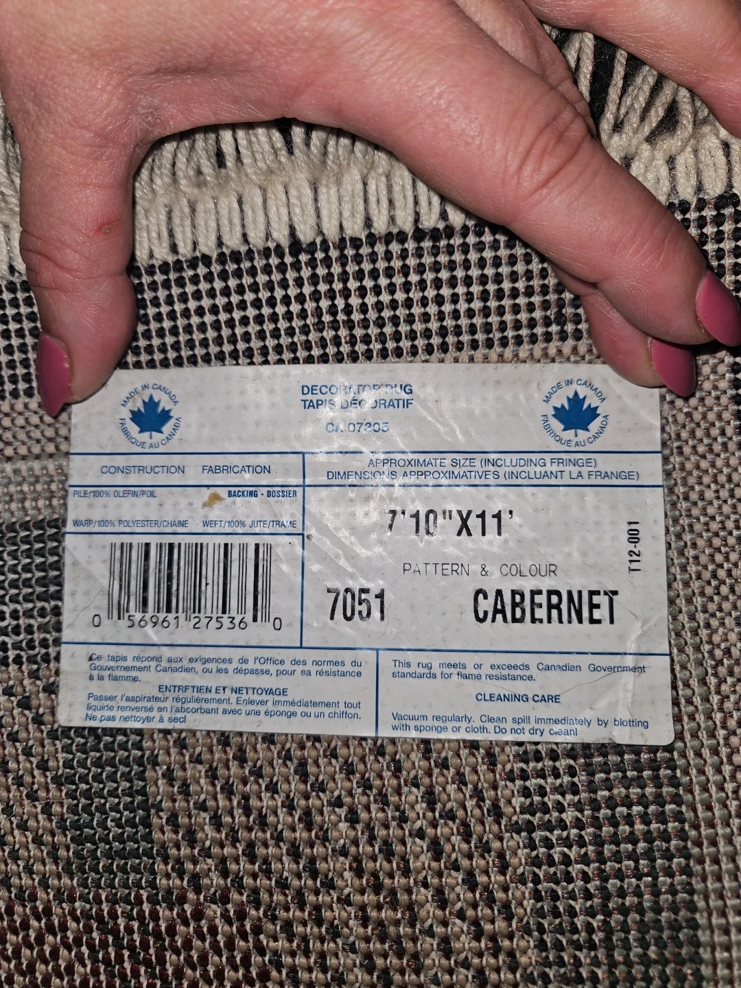 Its dimensions are approximately 7 feet 10 inches by 11 feet. The rug is made with a 100% polyester face and a jute backing.