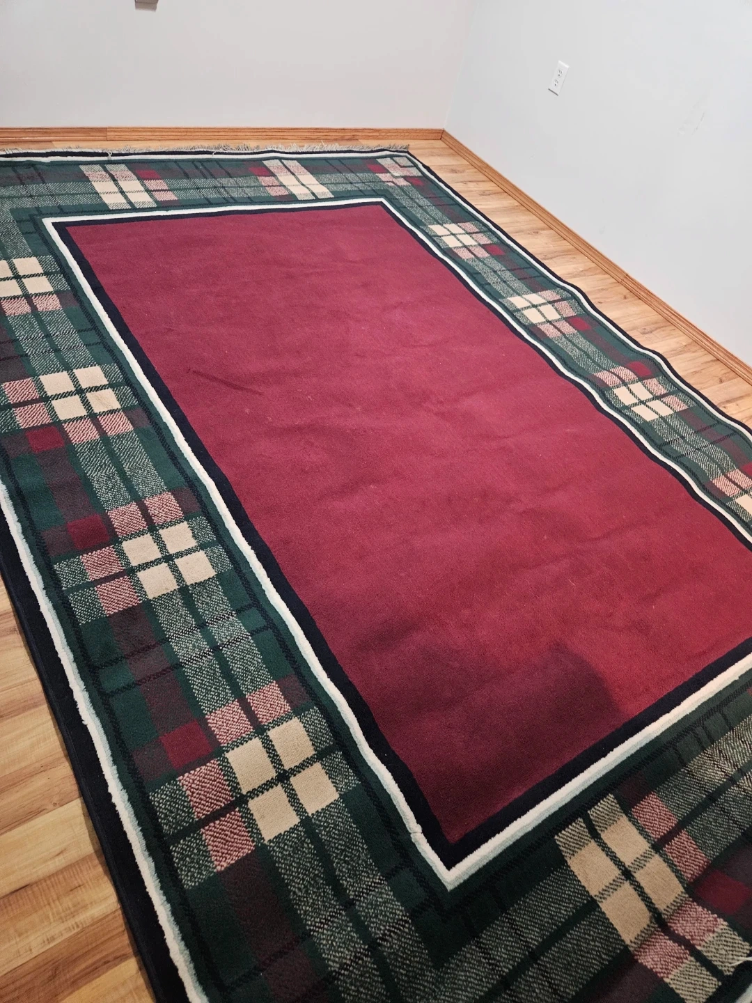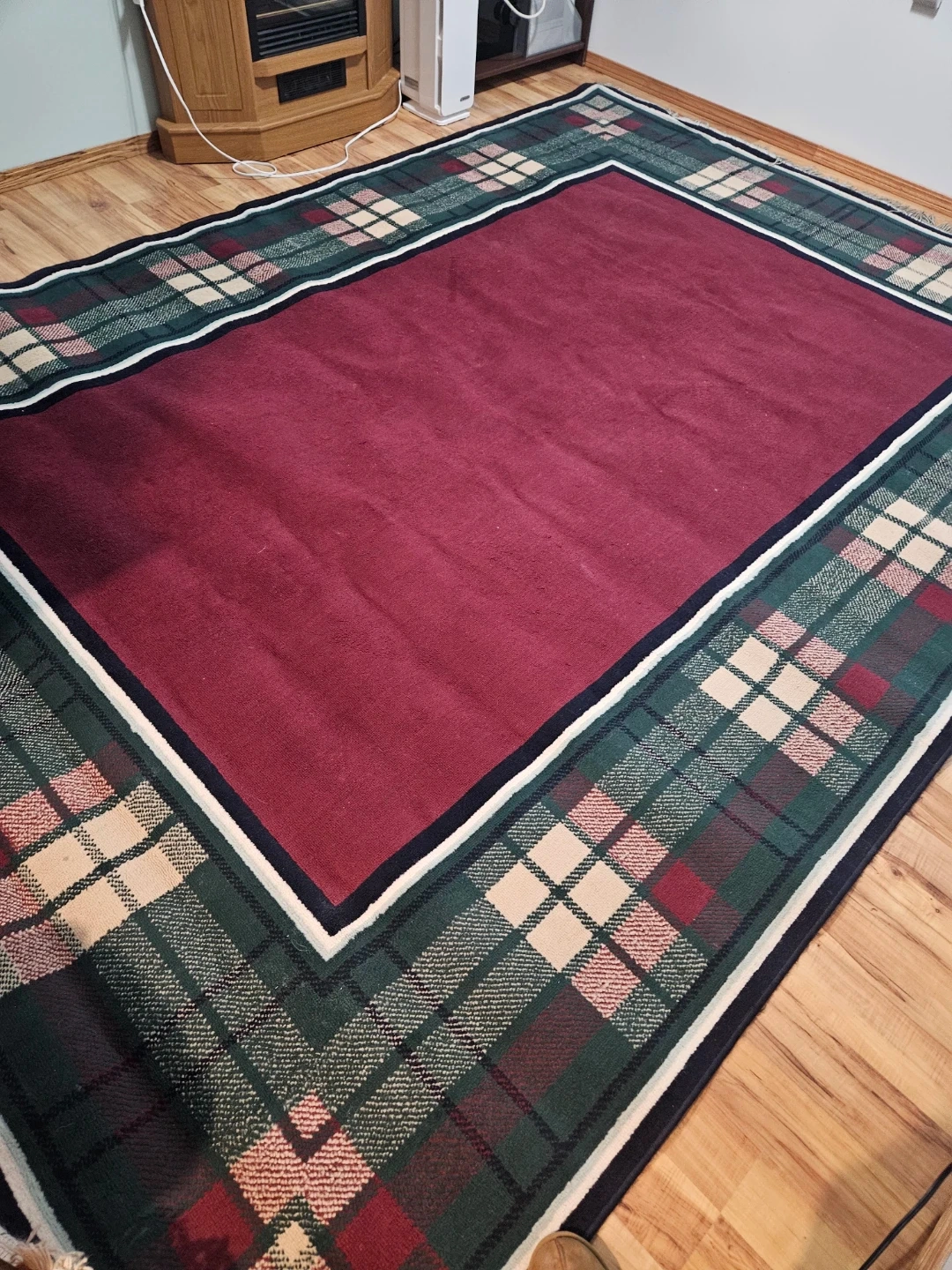 Decorative rug with a classic plaid pattern in green, burgundy, and cream.