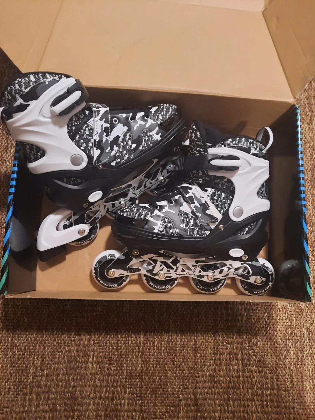 Kuxuan adjustable inline skates in a camo black design. These skates are designed for boys and girls, featuring light-up wheels. Comes with original box . Youth size large. 3-6