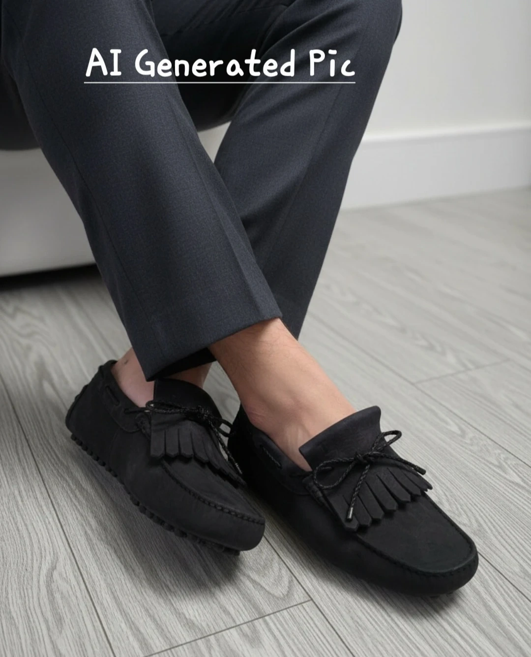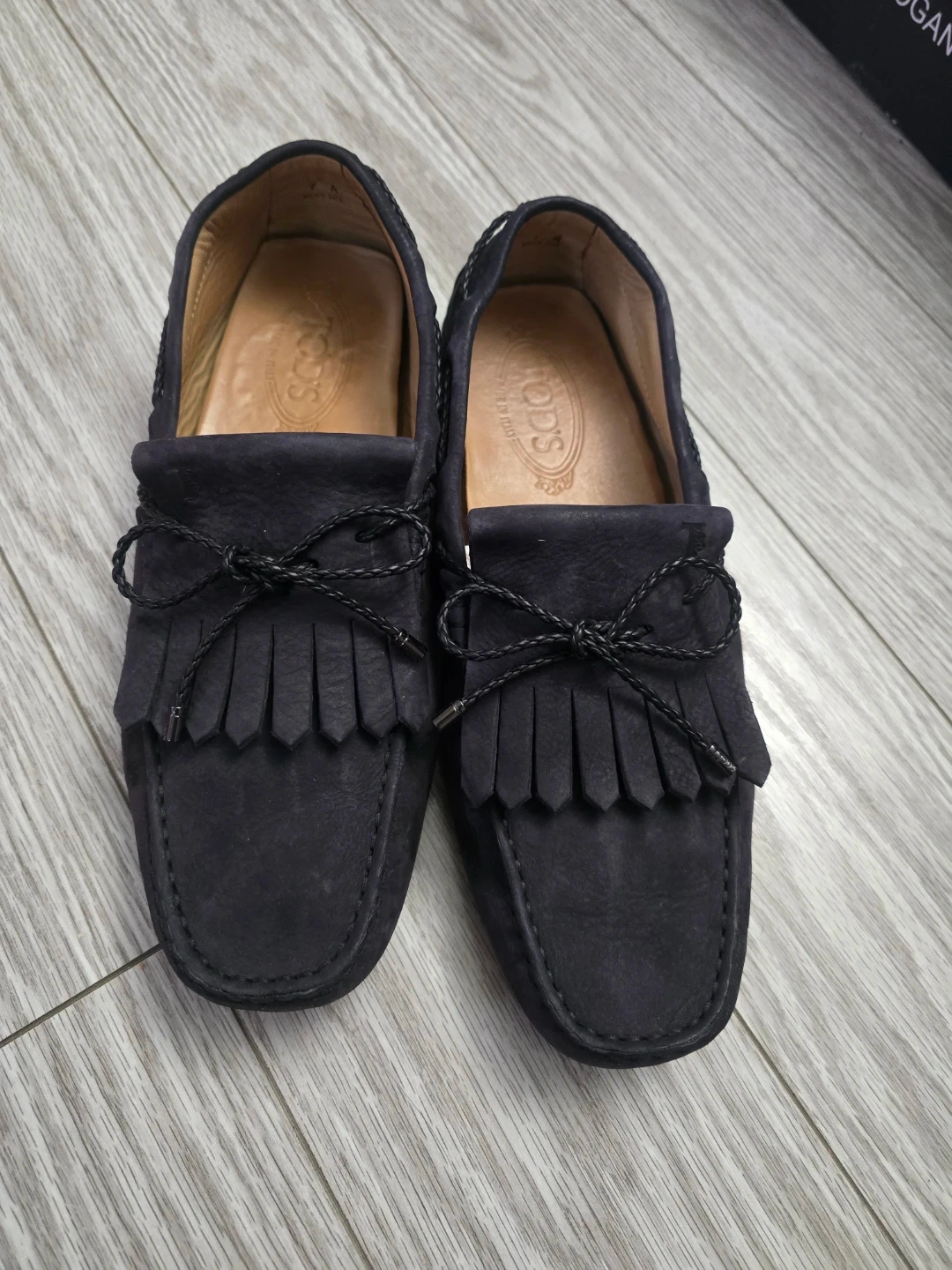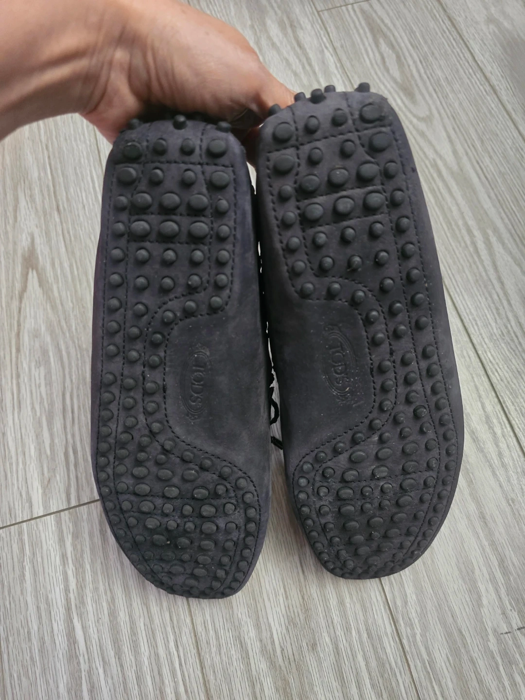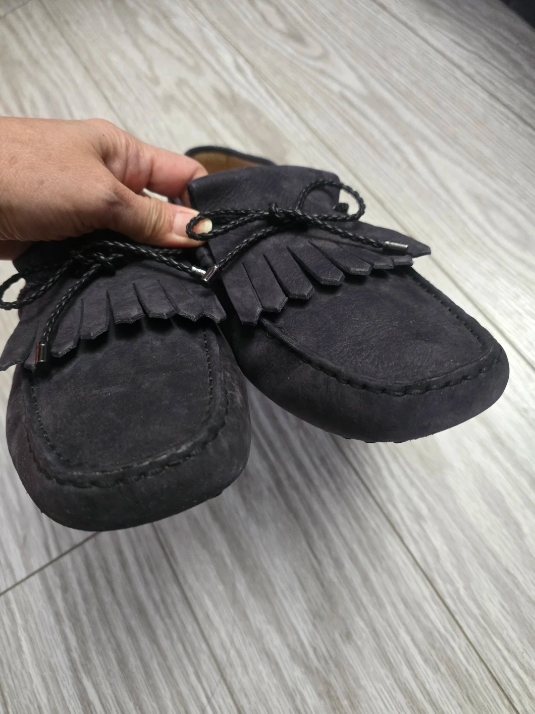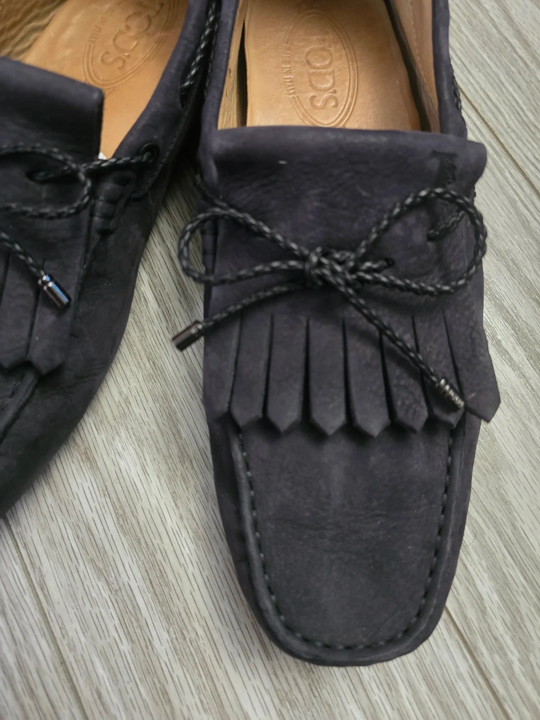 Here are a pair of Tod's loafers in black suede. They have a cute fringe and tie detail on the front. The rubber pebble soles are only use indoor for fitting.