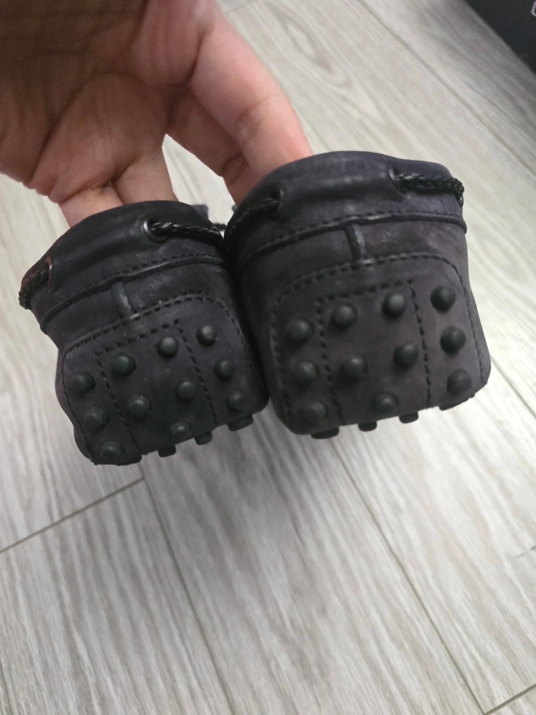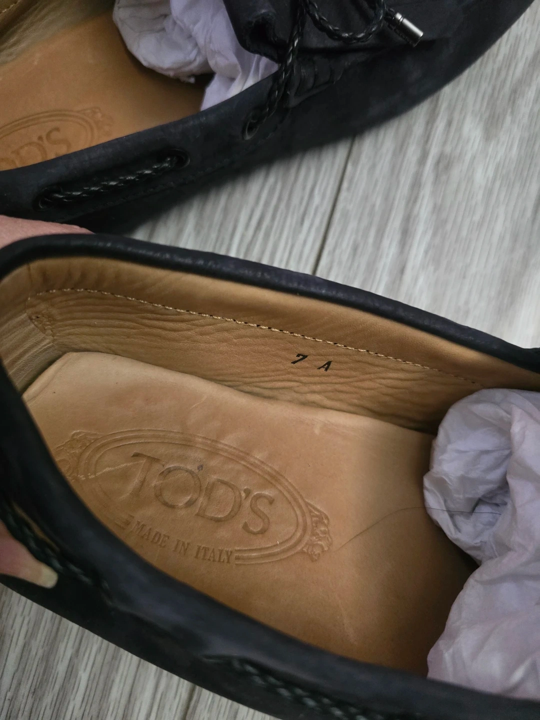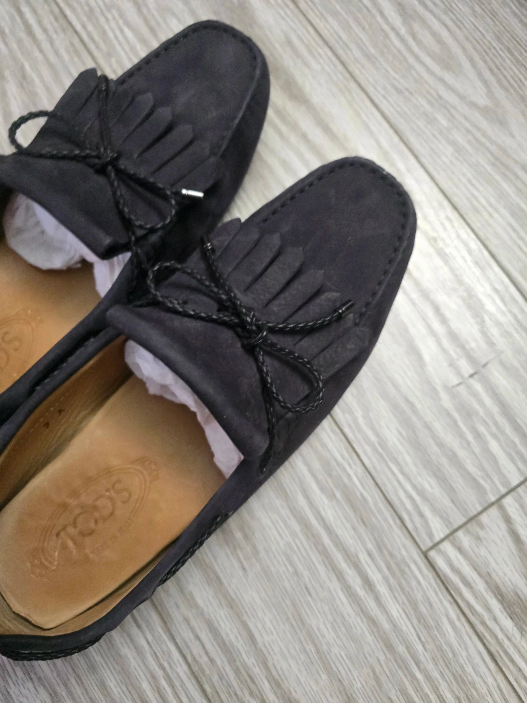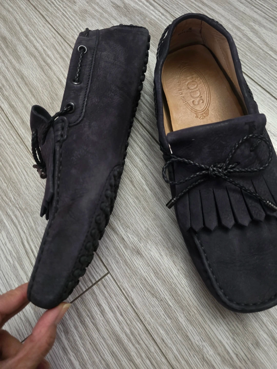 Here are a pair of Tod's loafers in black suede. They have a cute fringe and tie detail on the front. The rubber pebble soles are only use indoor for fitting.