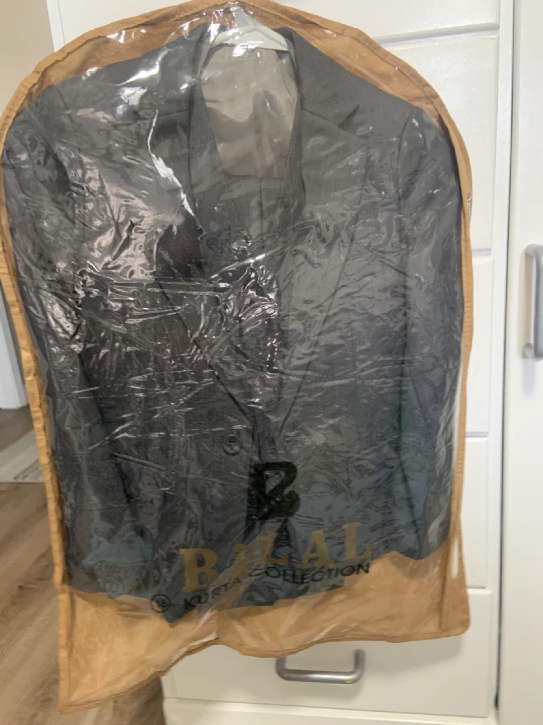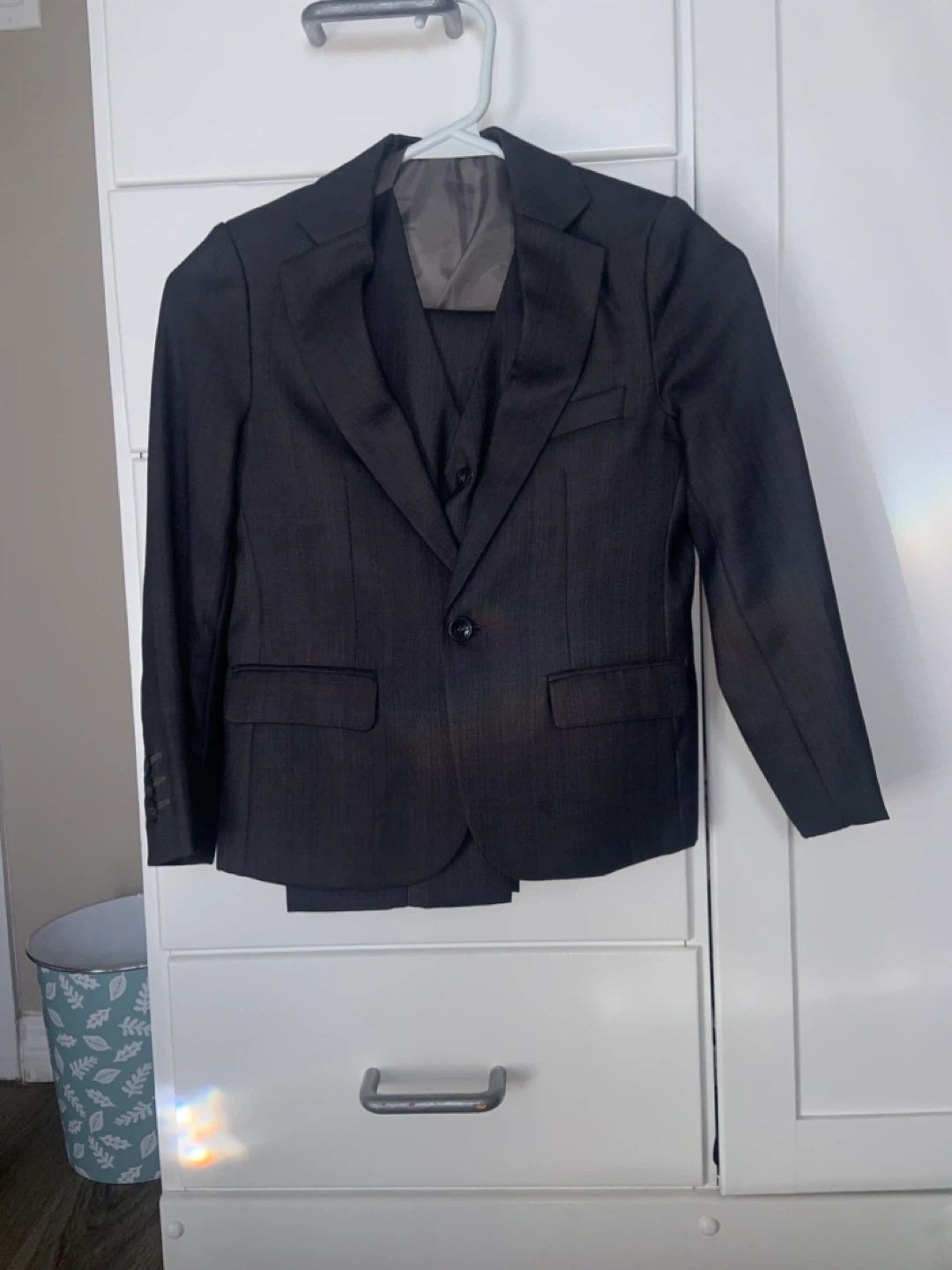 A three-piece suit for boys, including a blazer, vest, and matching pants. The suit is dark grey with a subtle pinstripe pattern. It's ready for any special occasion!
