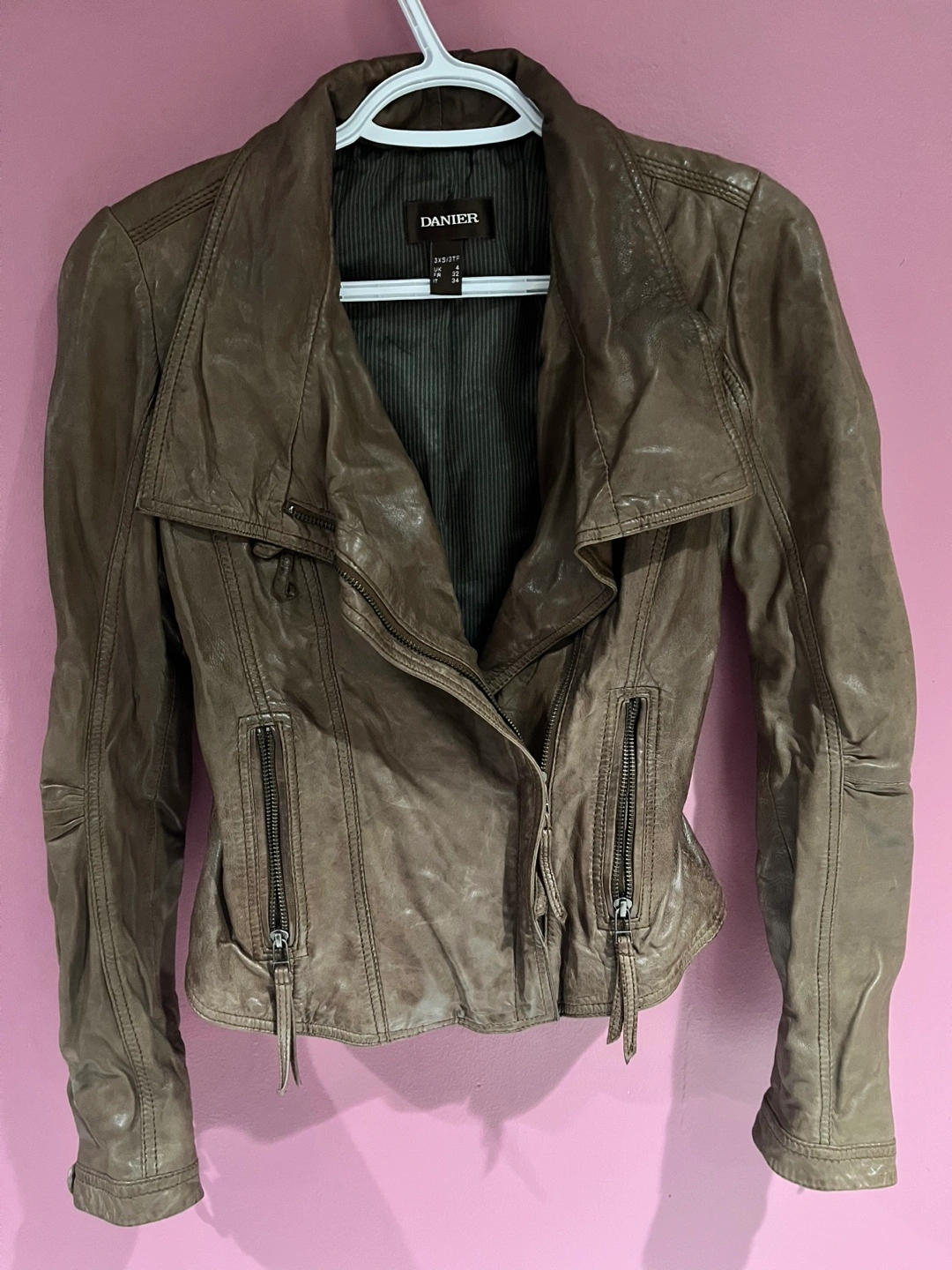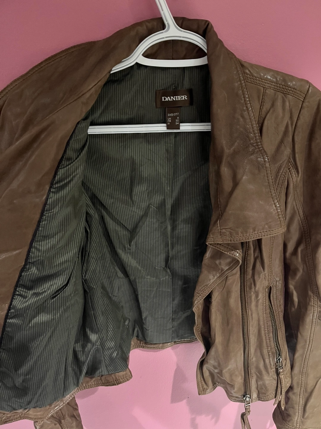 Brown leather jacket with asymmetrical zipper closure. Tag shows size 3xs/UK 4. I’ve included a size chart directly from danier’s website for measurements.