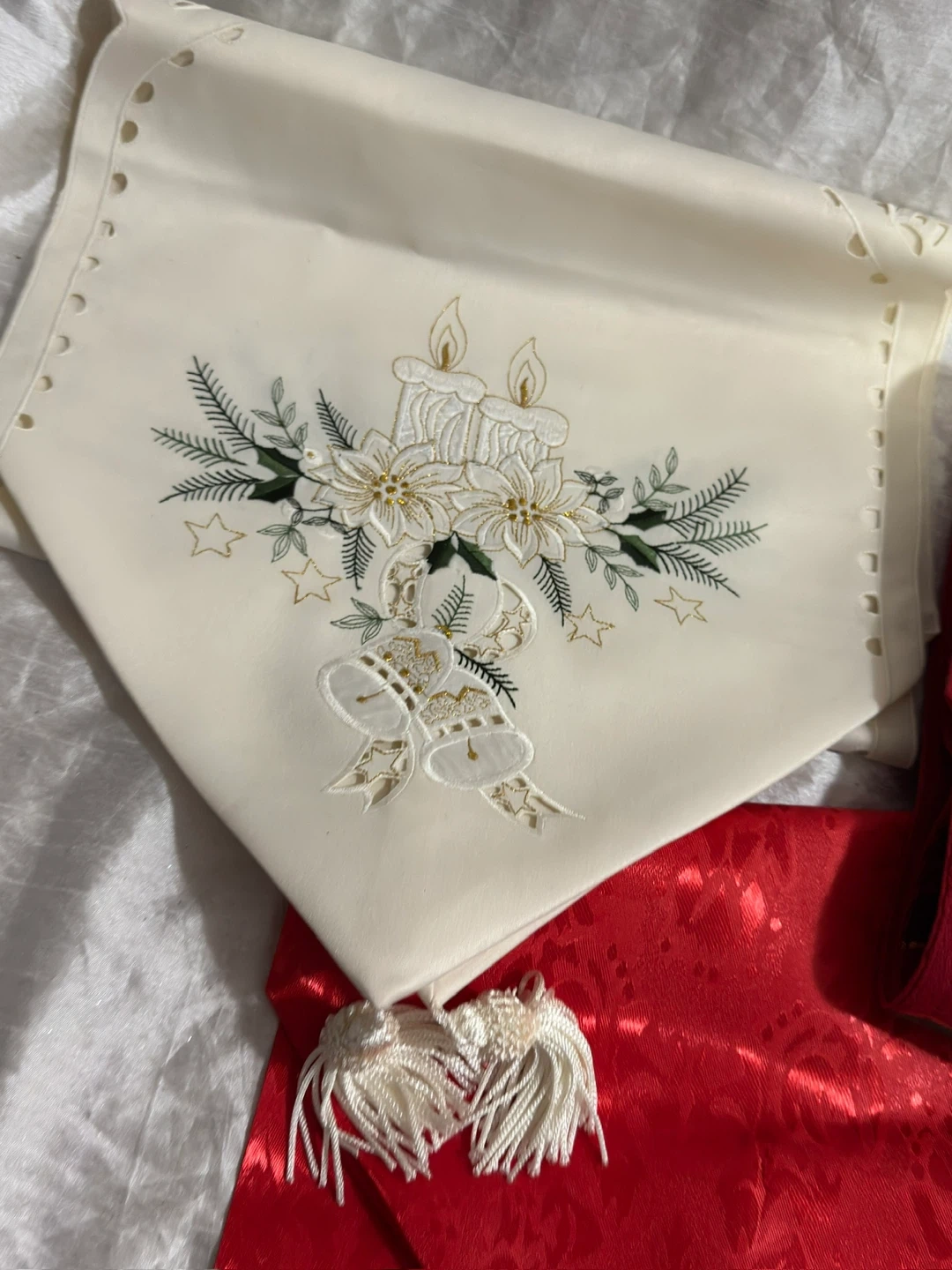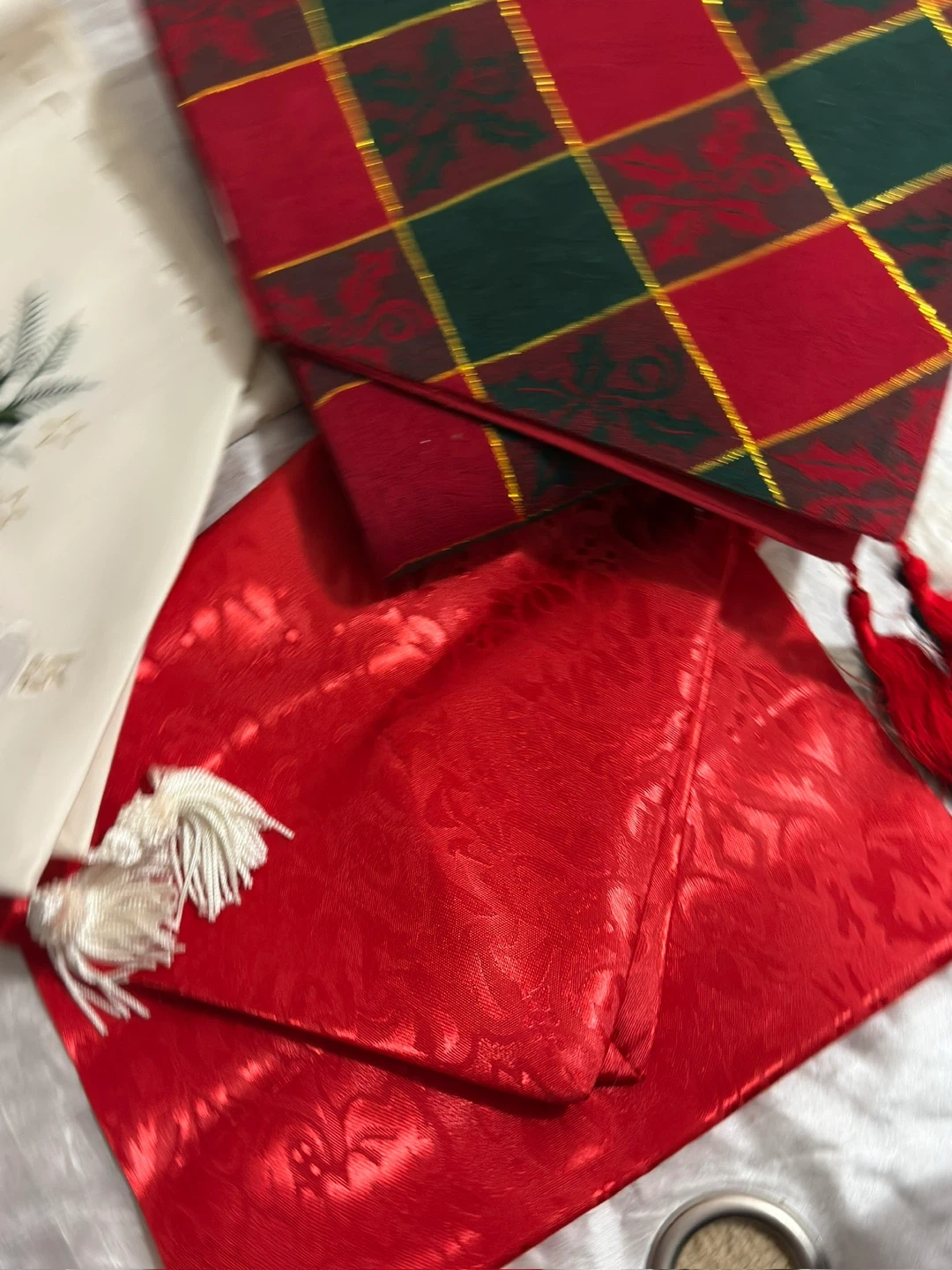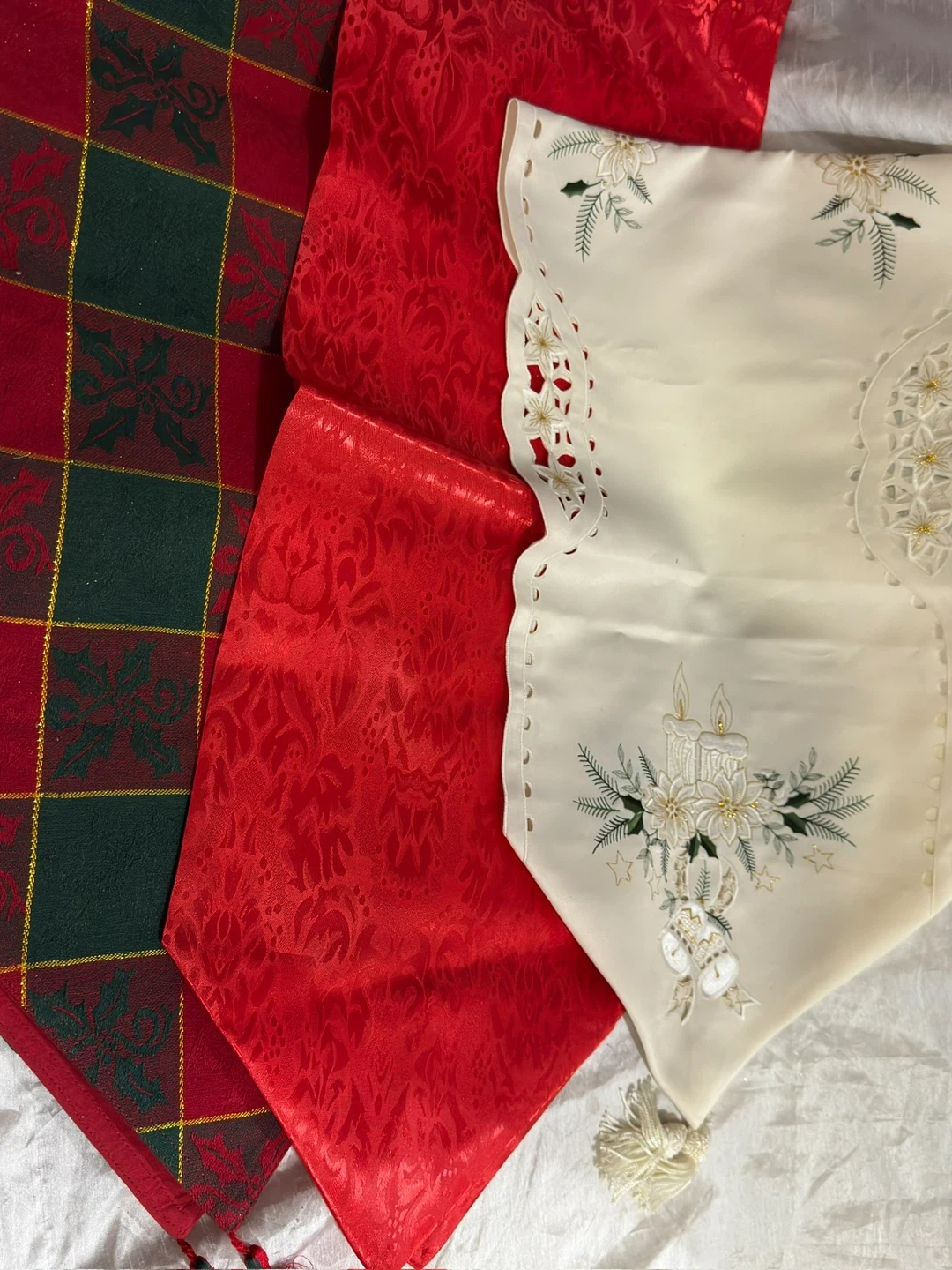 Three festive table runners perfect for the holiday season! One features a classic red and green plaid pattern with gold accents. Another is a solid red with an embossed damask design. The third is cream-coloured with a beautiful embroidered Christmas motif including candles, poinsettias, and bells. They're a lovely way to decorate your dining table for gatherings!