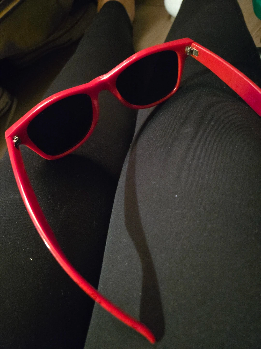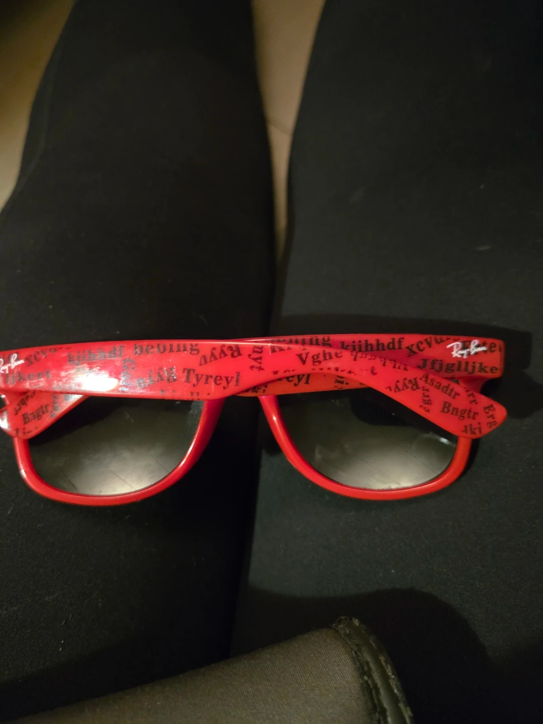 These are red Ray-Ban Wayfarer sunglasses with a graphic print on the frames. They offer classic styling with a bold look. Perfect for sunny days!
