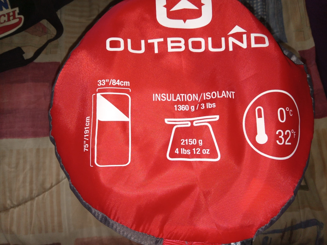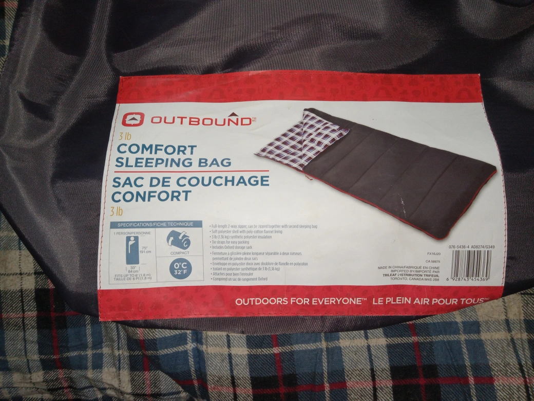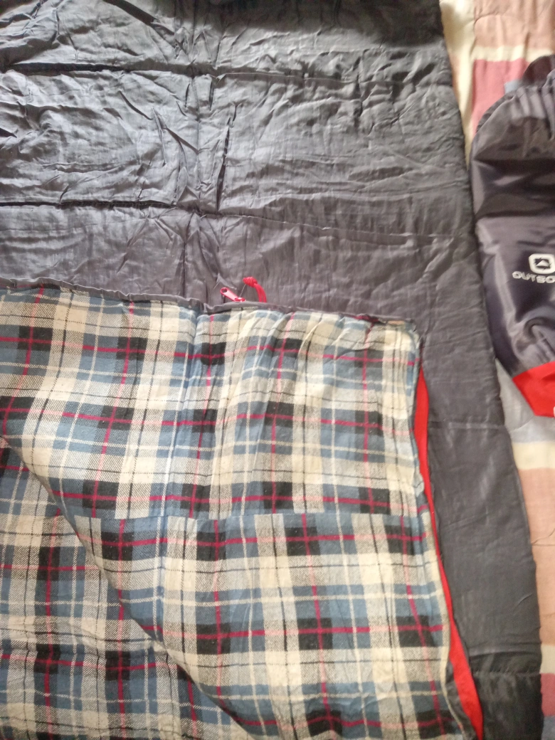 Grey sleeping bag with plaid liner. Full length zipper. Compact design. Suitable for temperatures down to 0°C (32°F). Comes with a stuff sack.