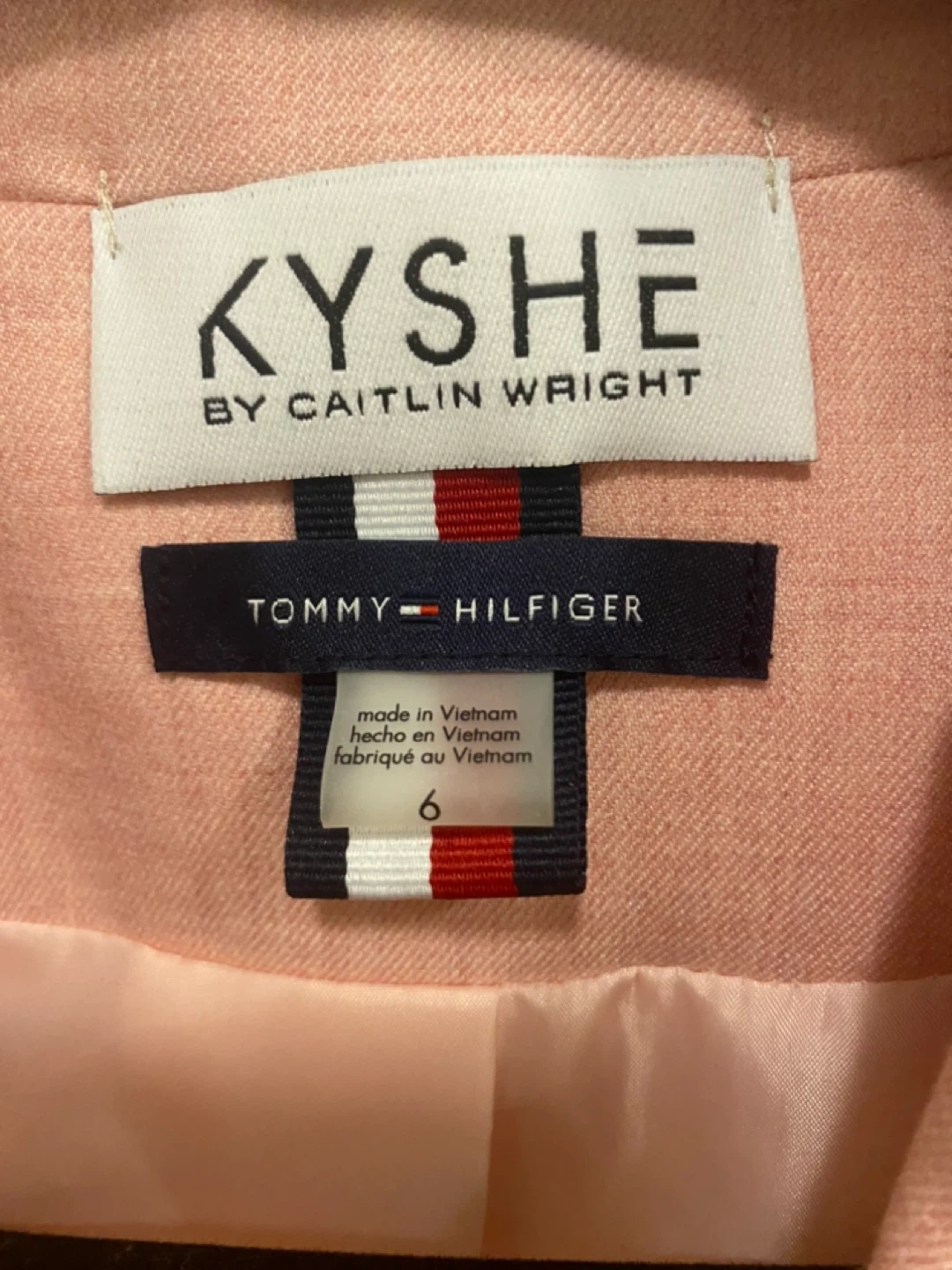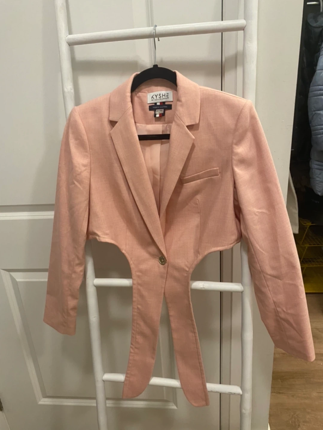 This is a KYSHÉ by Caitlin Wright cropped blazer. It's a size 6 and a lovely pastel pink colour. Features a single button closure and cut-out sides with tie detailing. Made in Vietnam.