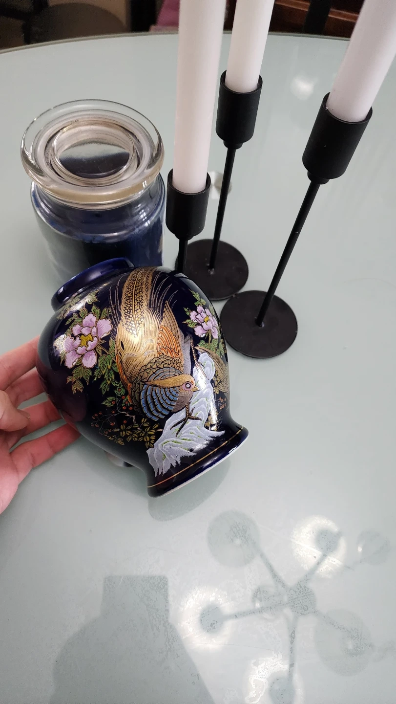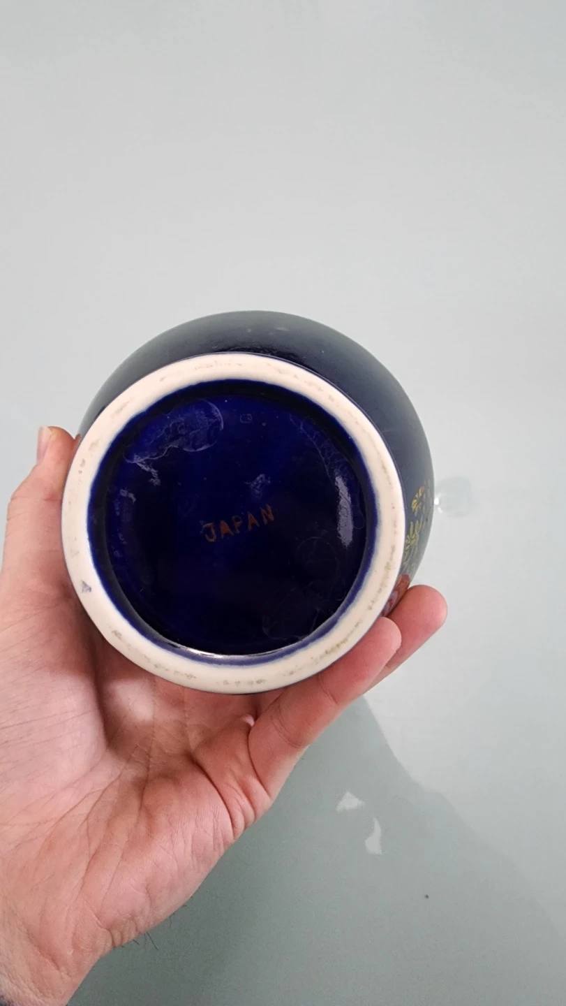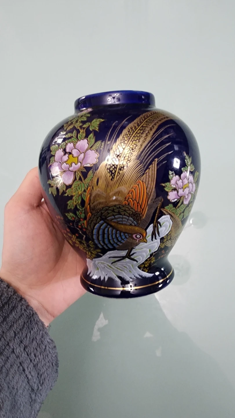 Beautiful navy blue vase featuring a colourful bird and floral motif. This decorative piece is made of ceramic with a glossy finish. It's stamped 'Japan' on the bottom