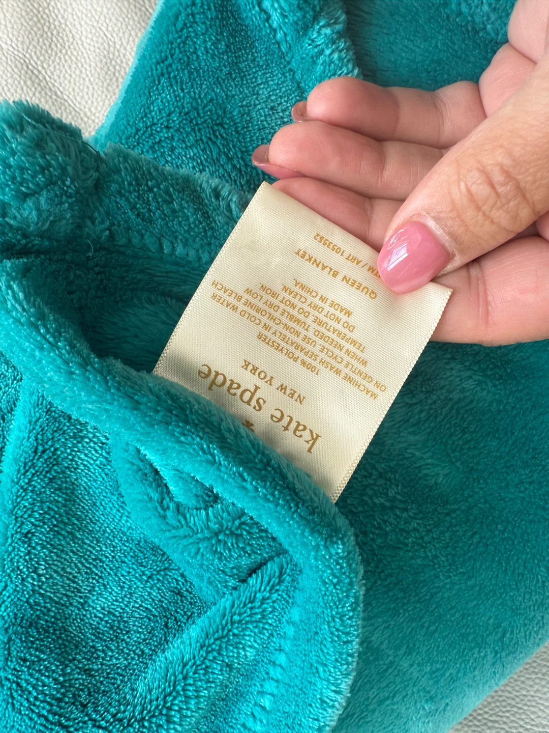 Here's a lovely teal Queen blanket from Kate Spade! It's made of 100% polyester and is super soft and cozy. This blanket is in great condition and ready to keep you warm on those chilly nights