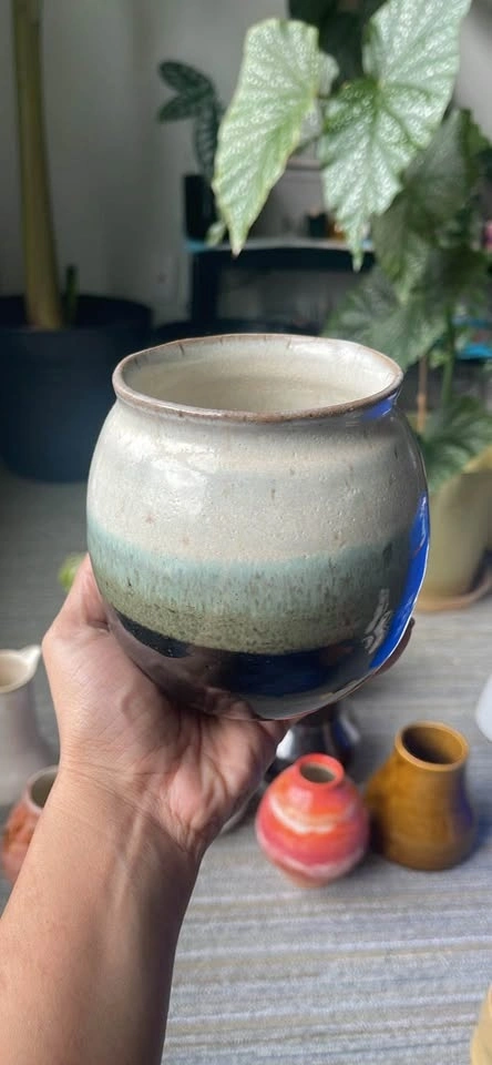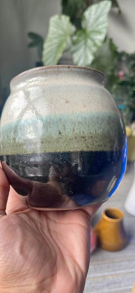 Selling a unique handmade ceramic pot! It features a lovely gradient design with cream, light teal, and dark brown/black glaze bands. Perfect for adding a touch of artistry to your home decor!