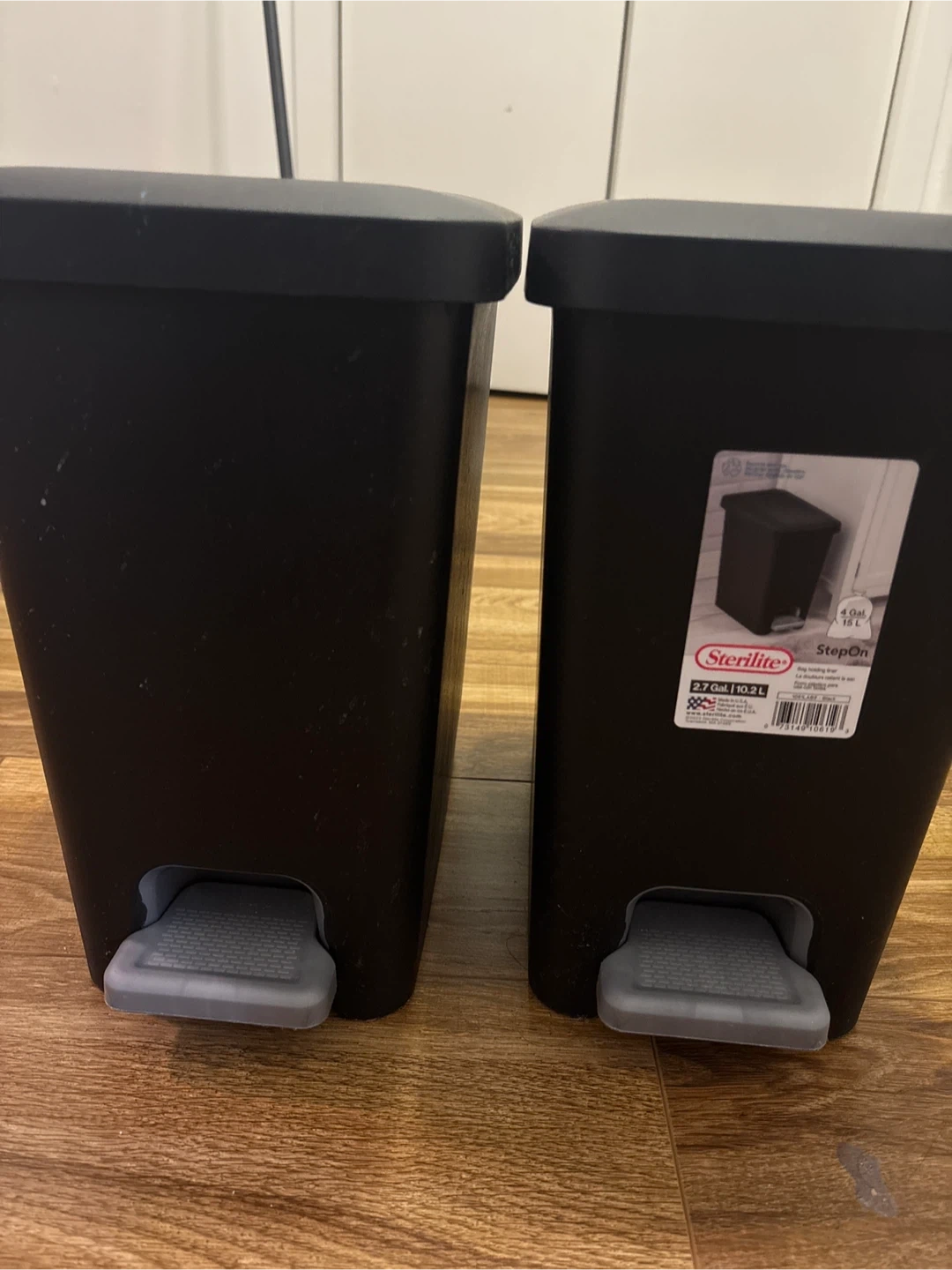 Two black Sterilite StepOn waste cans. Each holds 10.2 L or 2.7 US gallons. Features a step pedal for hands-free operation.