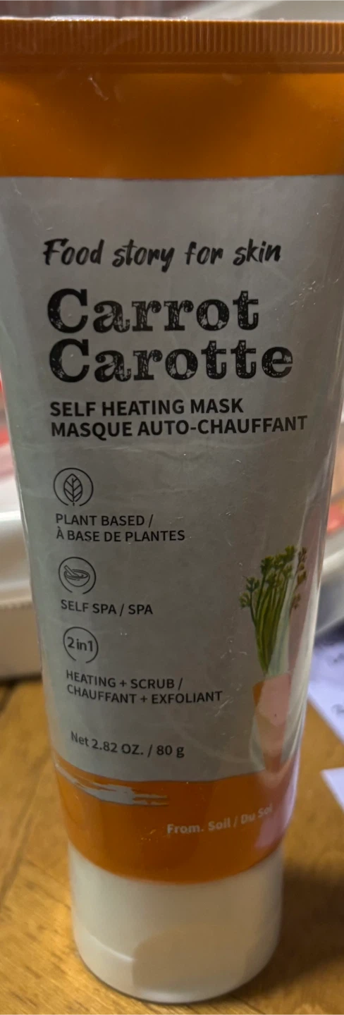 This is the Carrot Carotte Self Heating Mask. It's plant-based and offers a 2-in-1 heating and scrub experience. Net weight is 2.82 oz / 80g.