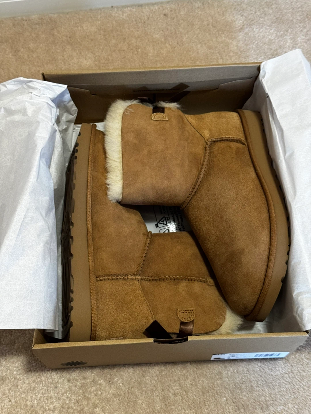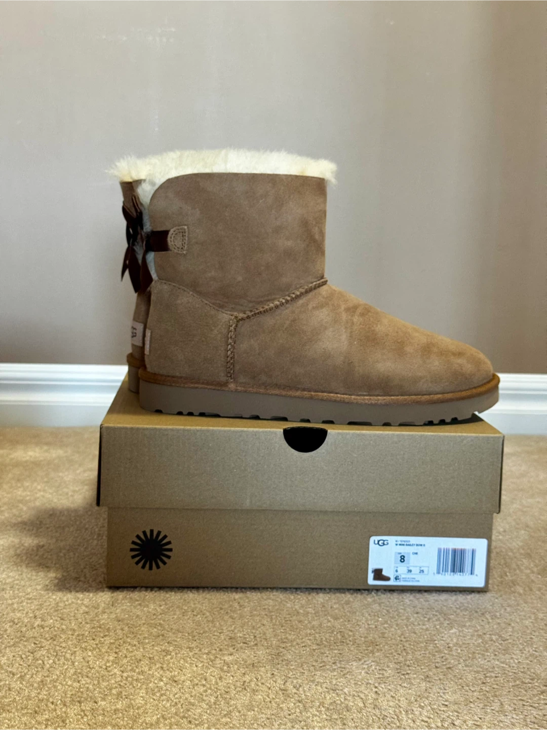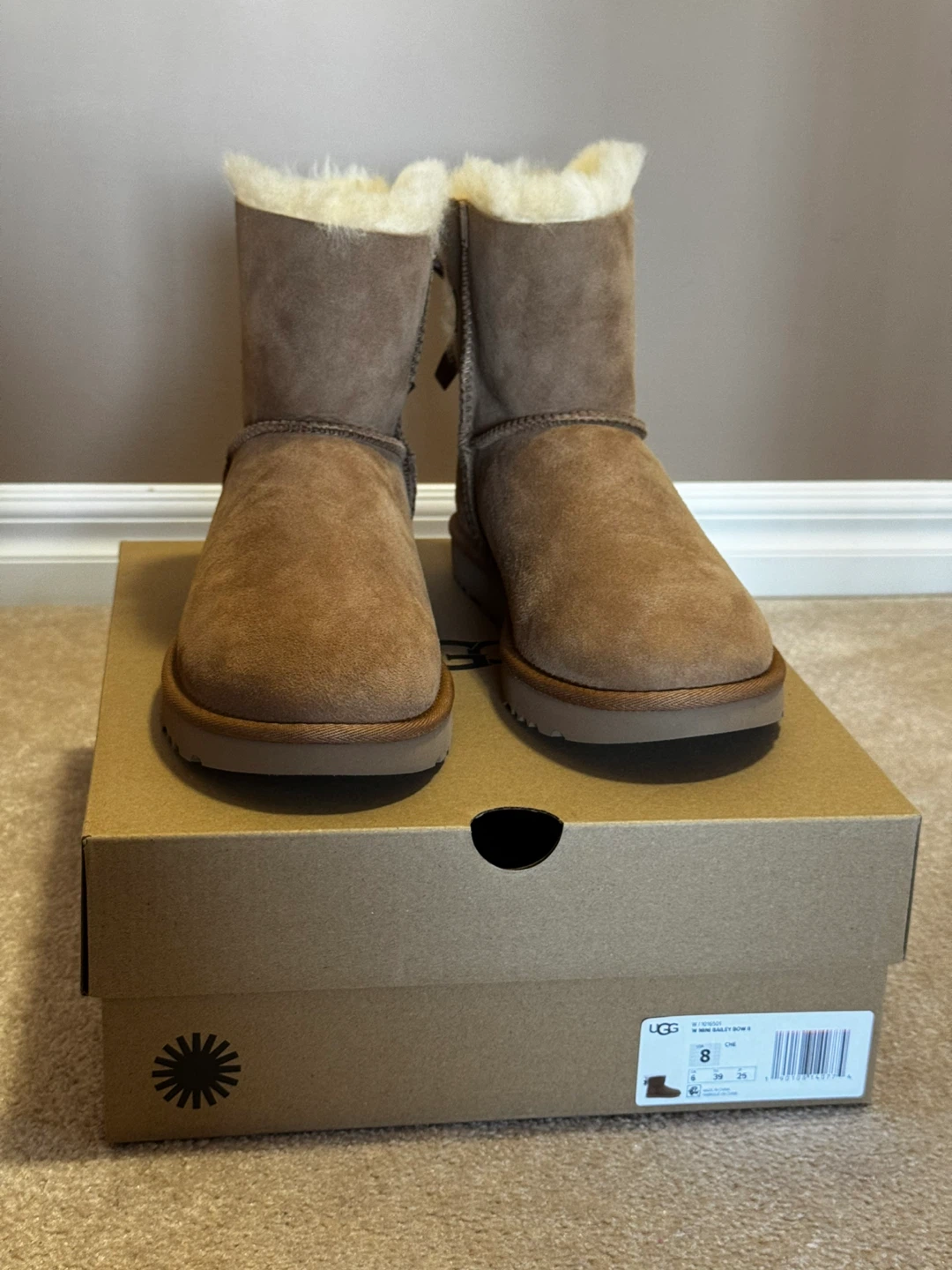 Selling a pair of UGG Bailey Bow II boots in size 8. They are in great condition and come with the original box! These cozy boots are perfect for keeping your feet warm and stylish during the colder months. The Bailey Bow II features a cute ribbon detail on the back, adding a touch of flair to the classic UGG design. PICKUP in Cranston SE. No Delivery