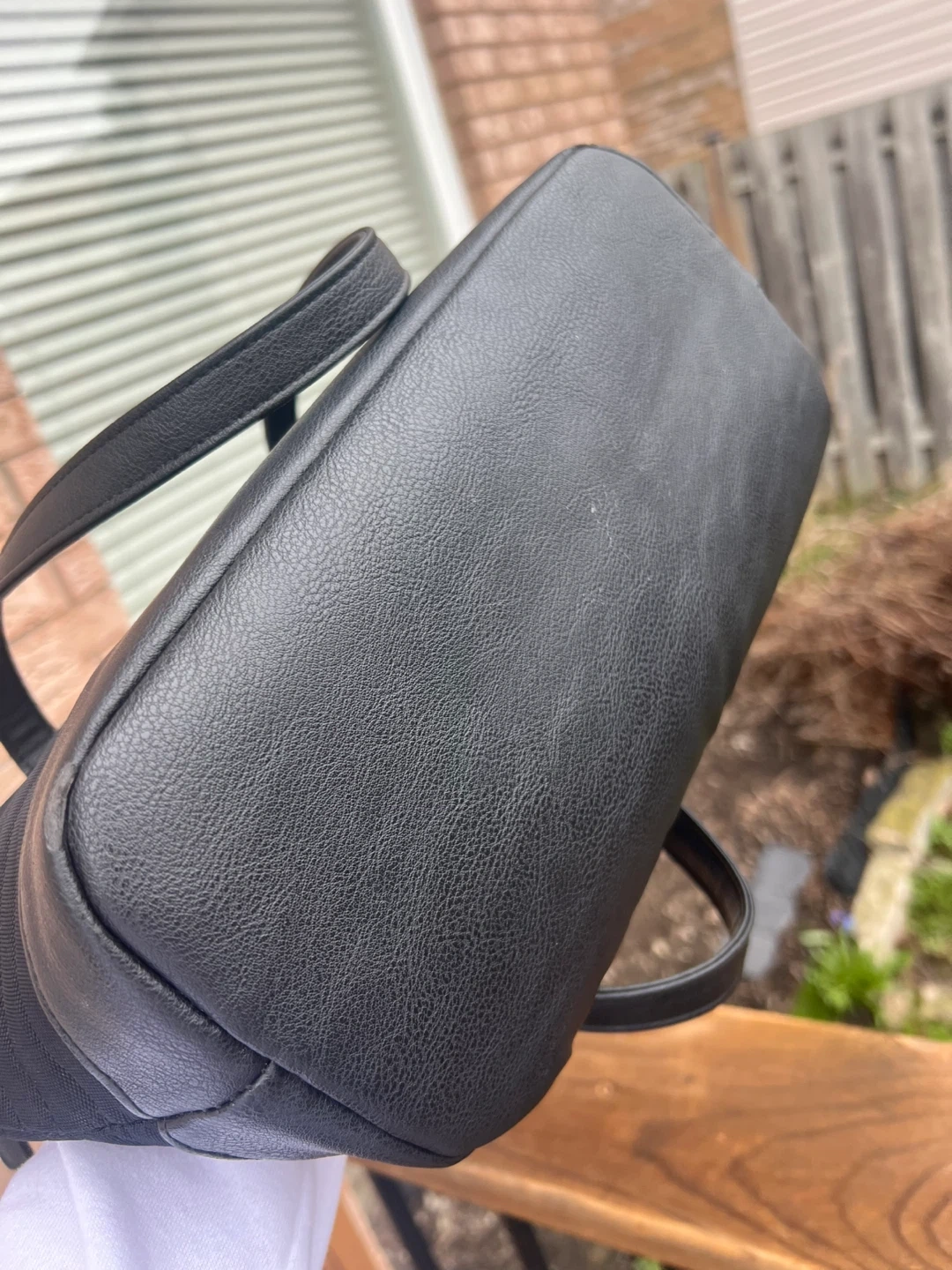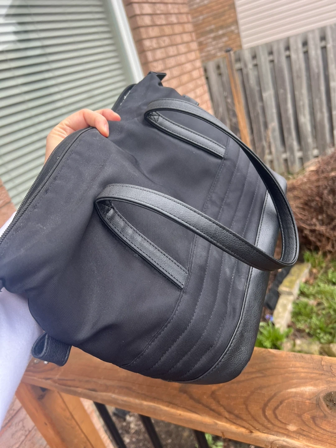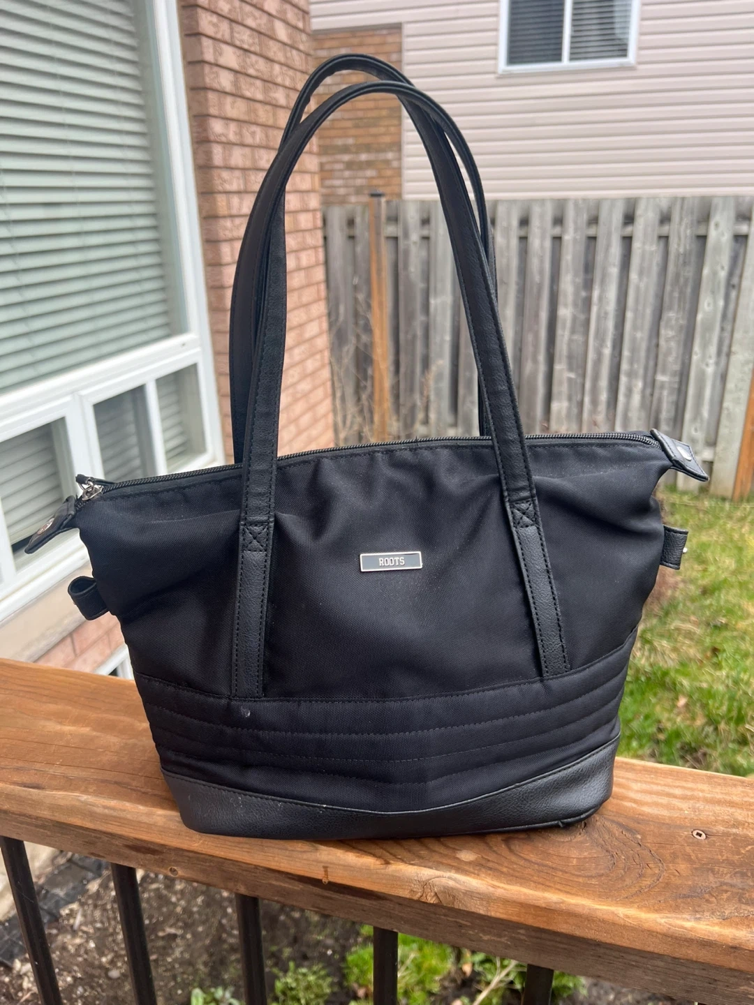 This Roots insulated tote bag is black with faux leather trim. It's fully insulated inside to keep food and drinks cool. Perfect for packing lunches for work or school!