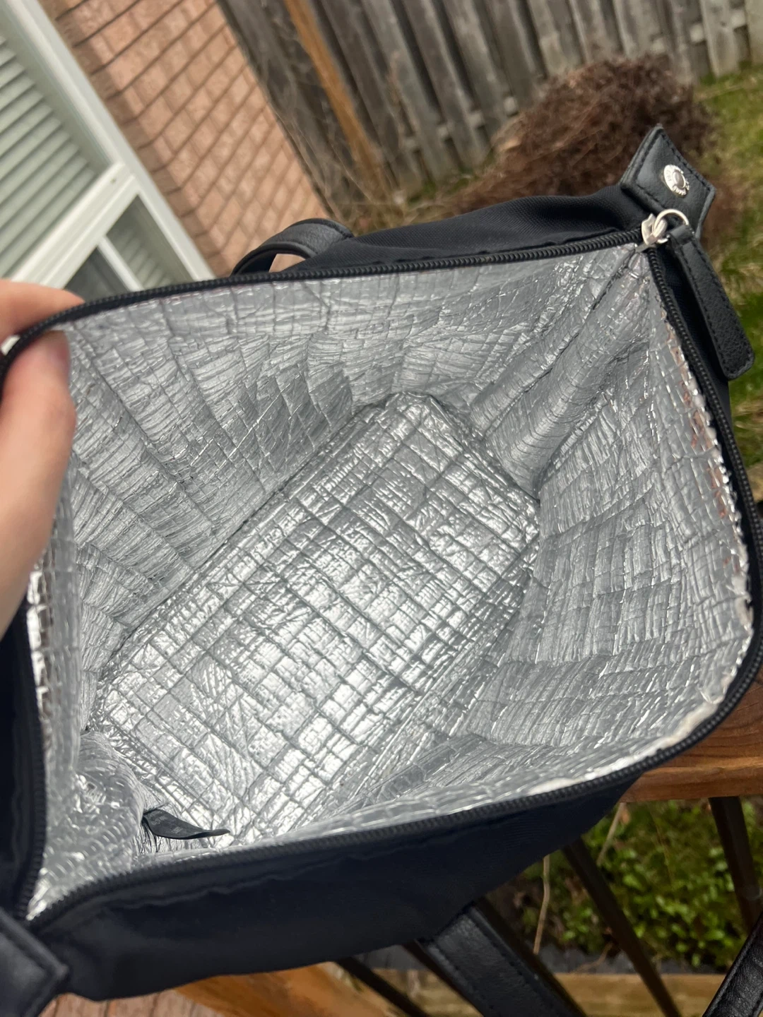 This Roots insulated tote bag is black with faux leather trim. It's fully insulated inside to keep food and drinks cool. Perfect for packing lunches for work or school!