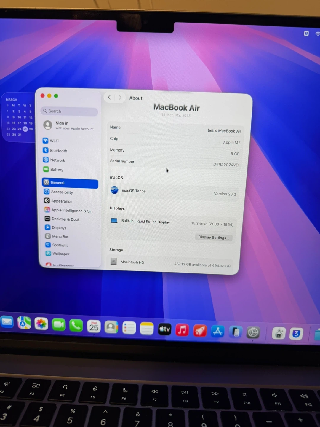 Apple MacBook Air with M2 chip. It has 8 GB memory and 494.38 GB storage. The display is 15.3-inch Liquid Retina.