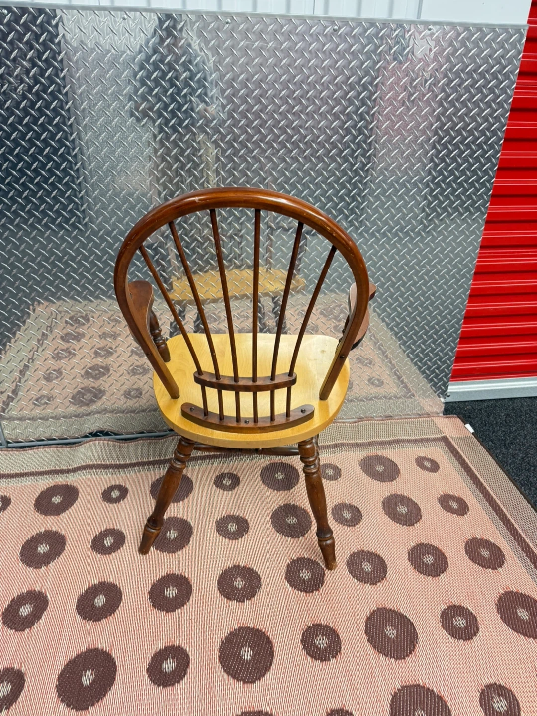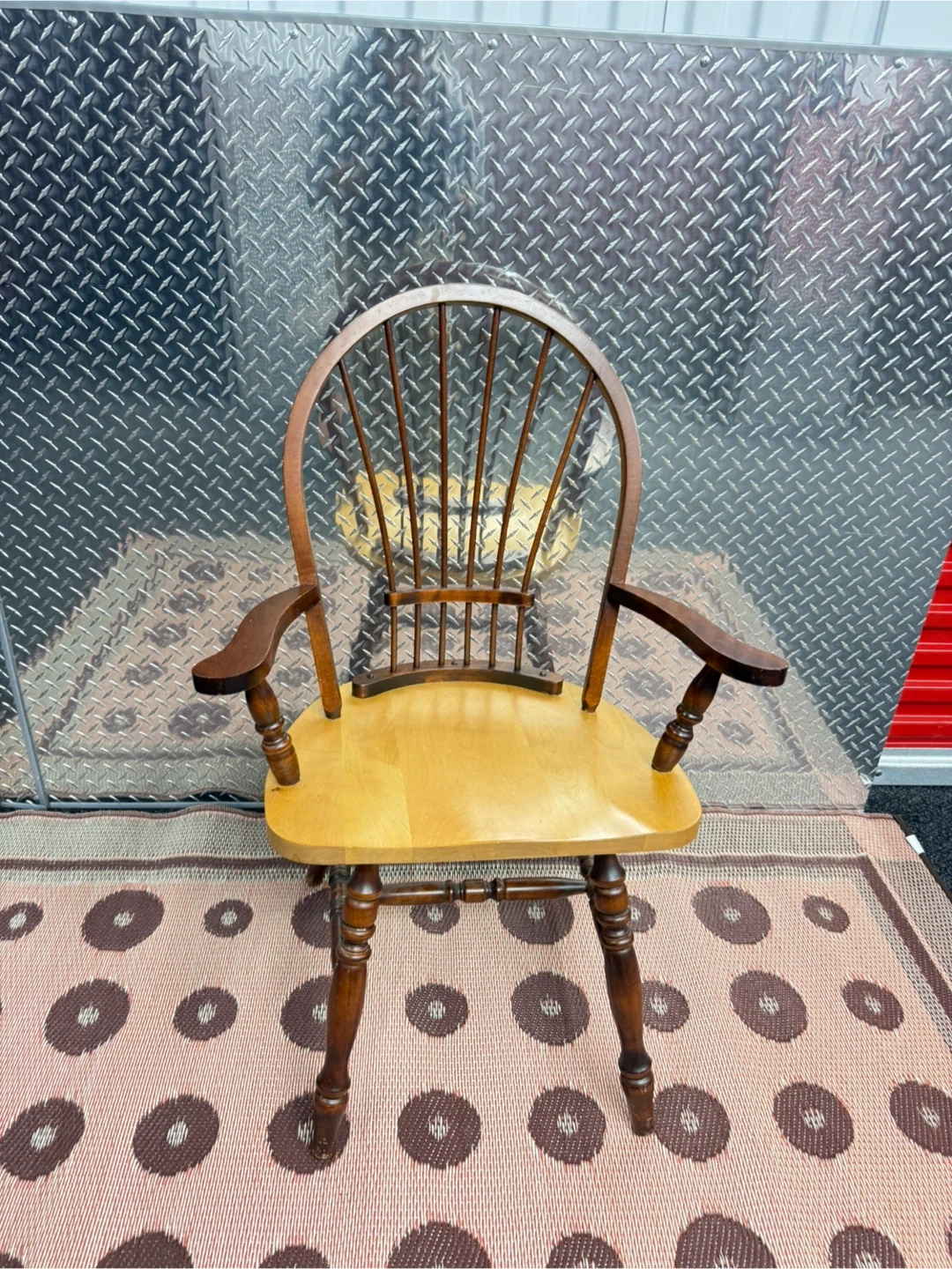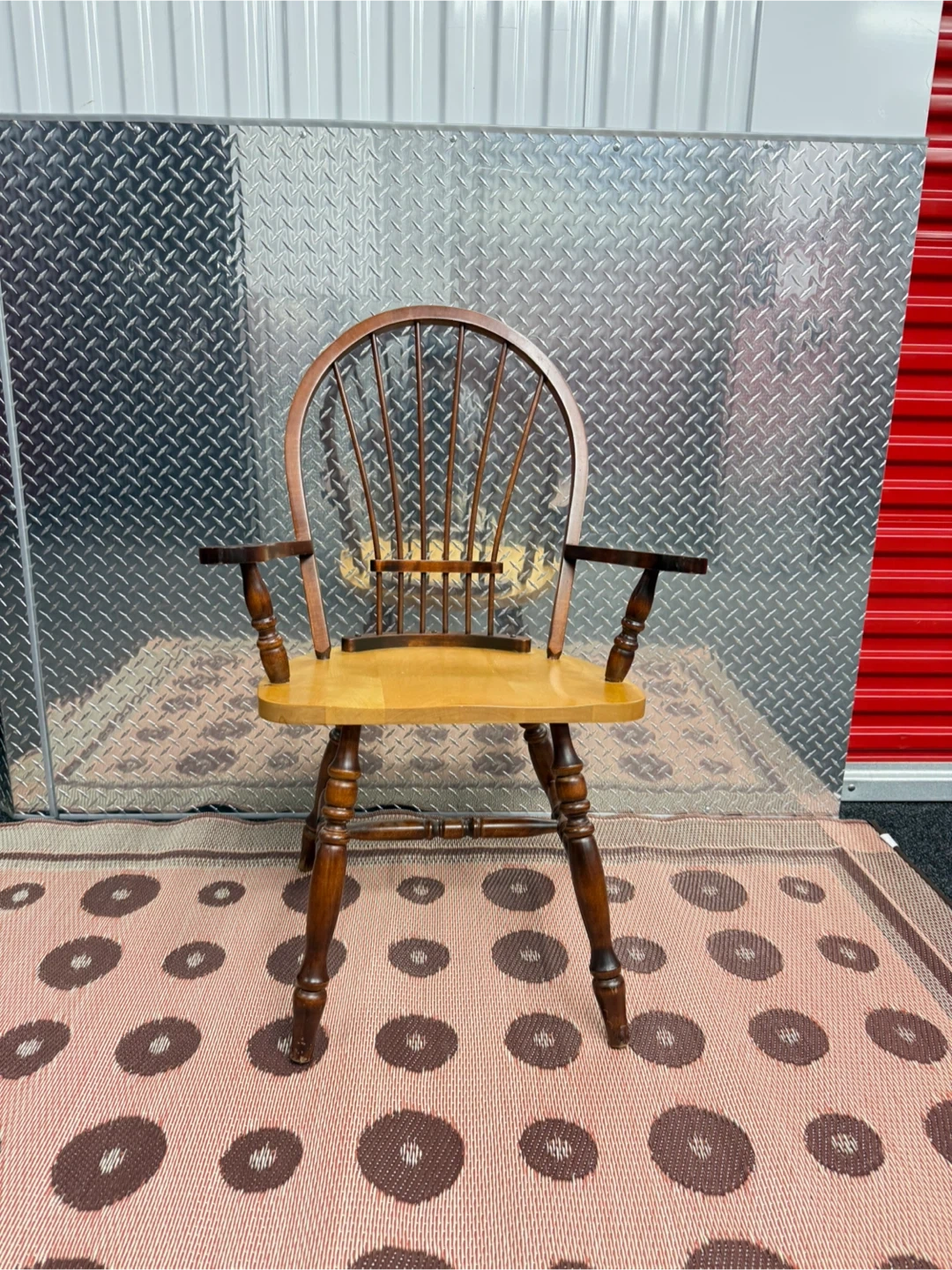 This is a classic Windsor style armchair with a wooden frame. It features a curved spindle back and solid wood seat. Its sturdy construction makes it a reliable seating option. The chair's timeless design complements various home decors.