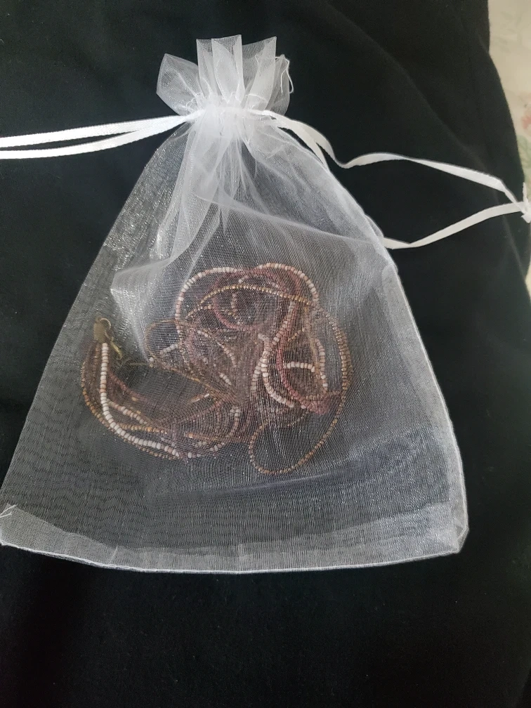 Free Here's a lovely beaded multi-strand necklace. It features a mix of earthy tones like brown, bronze, and cream. This necklace adds a touch of bohemian flair to any outfit!