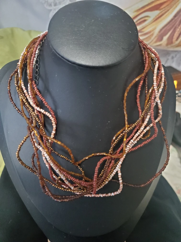 Free Here's a lovely beaded multi-strand necklace. It features a mix of earthy tones like brown, bronze, and cream. This necklace adds a touch of bohemian flair to any outfit!