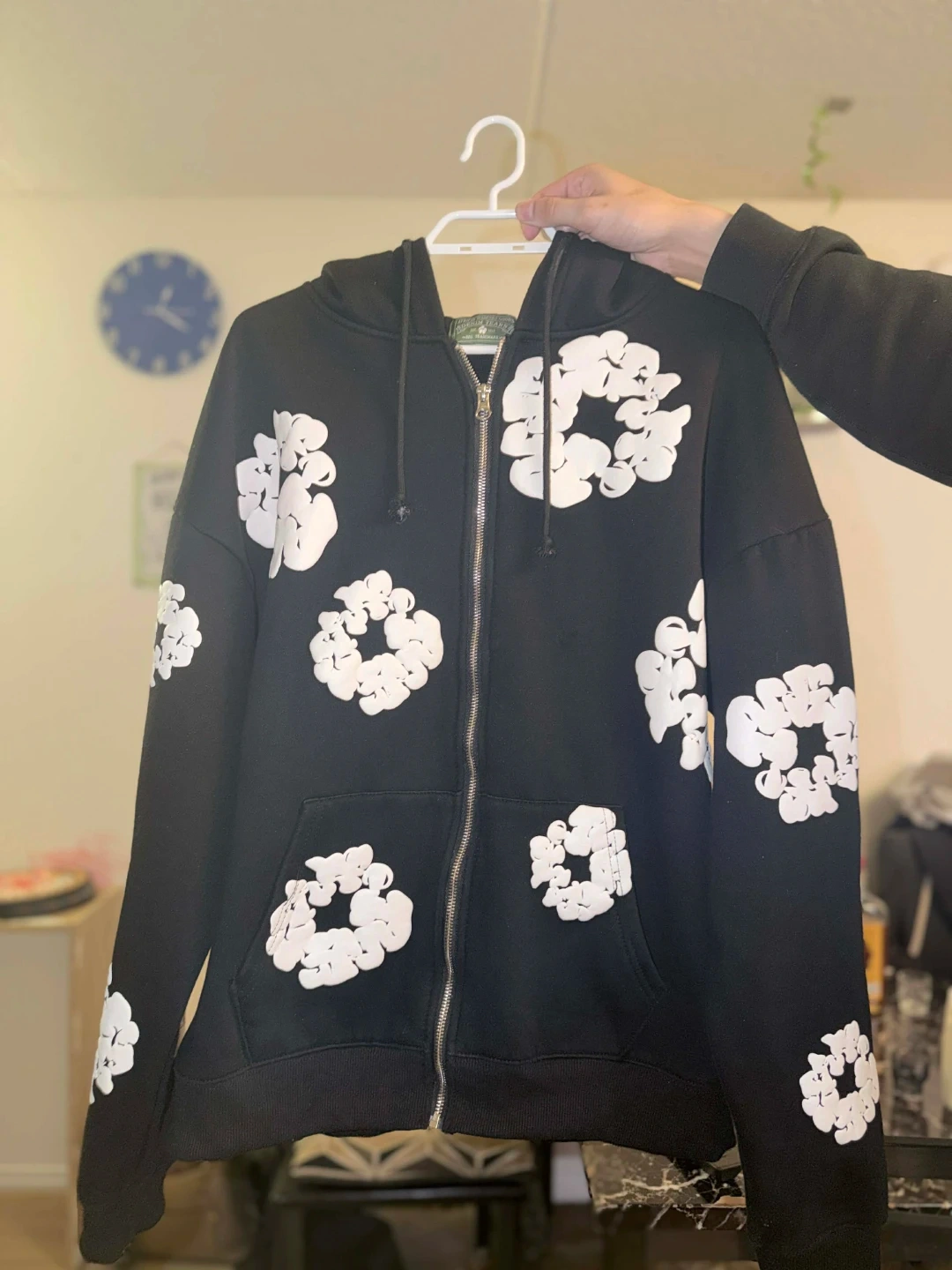 This black zip-up hoodie features a unique white for leaf clover pattern all over. It's a comfortable and stylish choice for everyday wear. The hoodie has a full zip closure and a drawstring hood.
