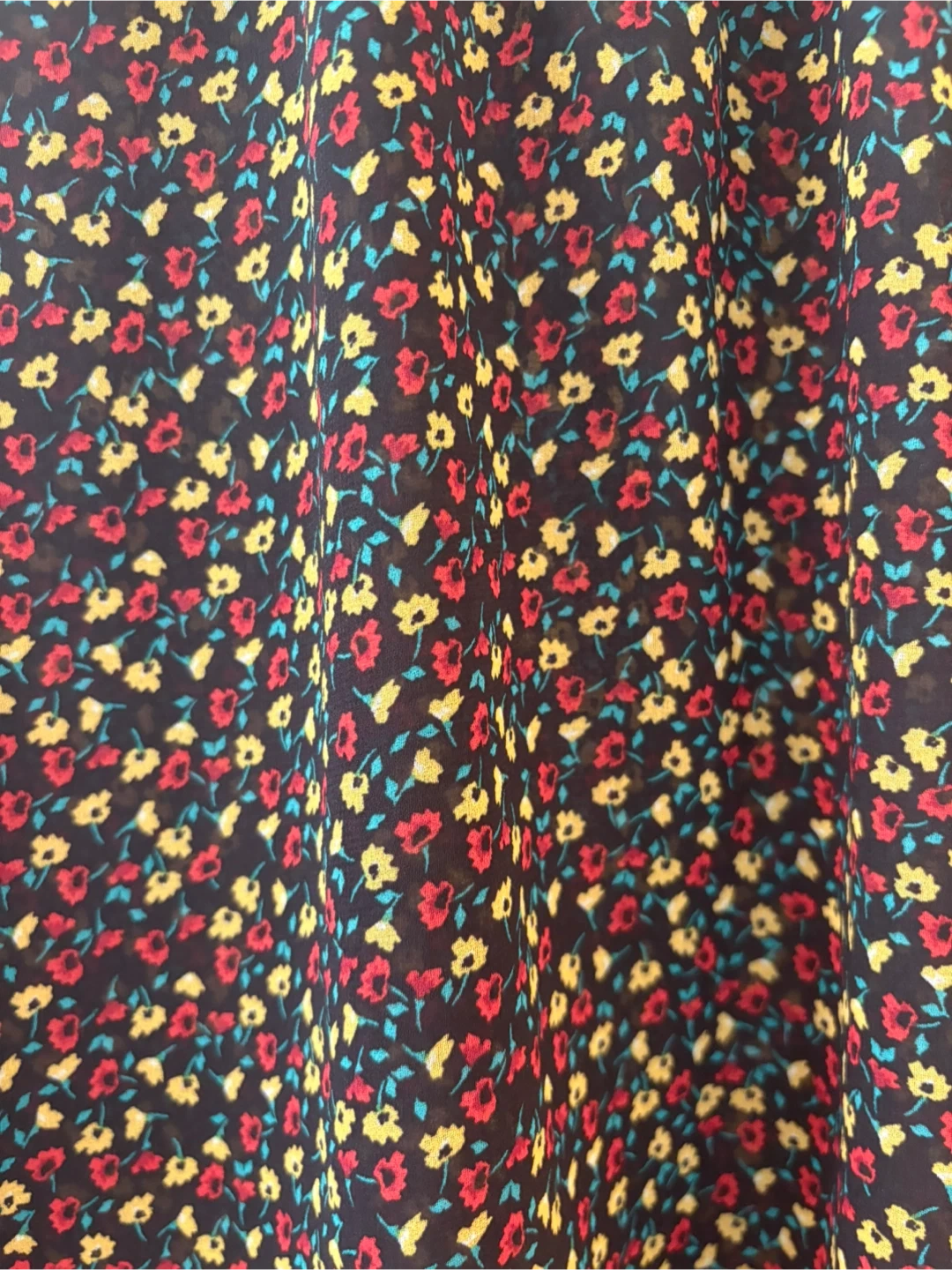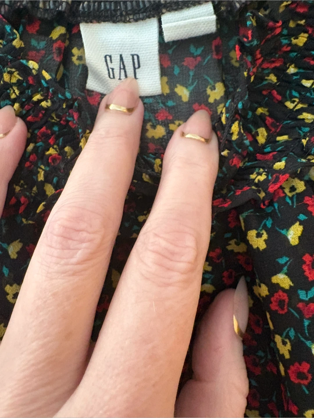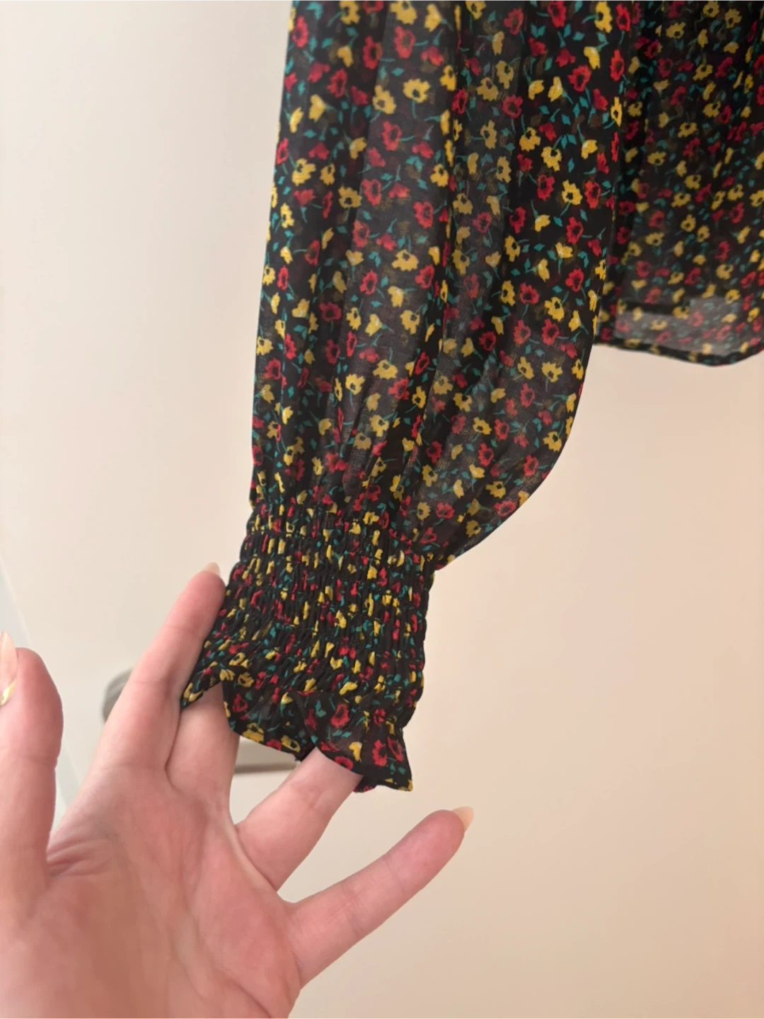 This Gap blouse features a dark floral print with red, yellow, and blue flowers. It has a ruffled mock neck and smocked cuffs. The fabric is lightweight and sheer.