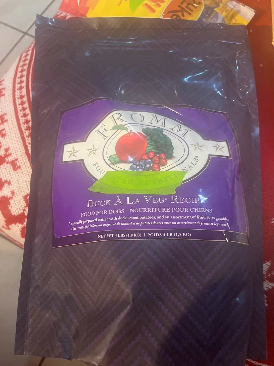 Fromm Four Star Nutritionals Duck A La Veg Recipe food for dogs. A specially prepared entree with duck, sweet potatoes, and an assortment of fruits & vegetables. Net wt 4 lbs (1.8 kg).