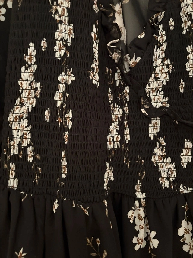 This chic black dress features a beautiful floral design, perfect for any occasion. The long sleeves add elegance and style. Pick up at King and Portland. Cash only.