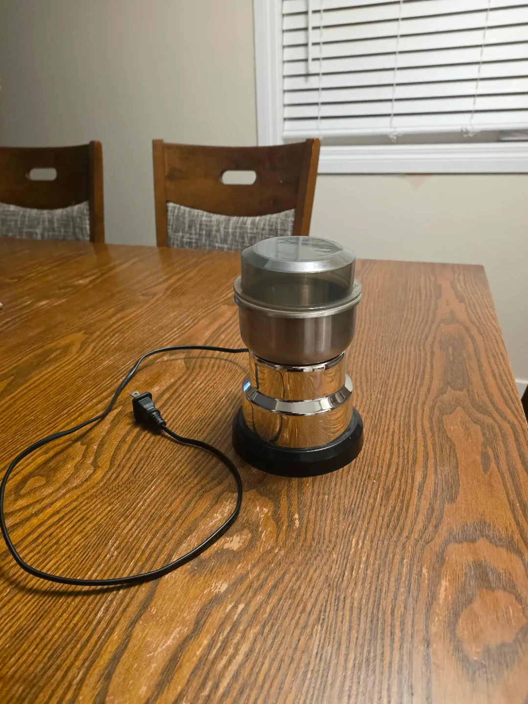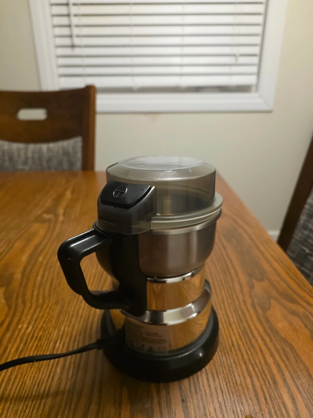Stainless steel electric coffee grinder with a sleek chrome accent band. It's suitable for grinding coffee beans and other dry ingredients. A handy appliance for fresh grounds!