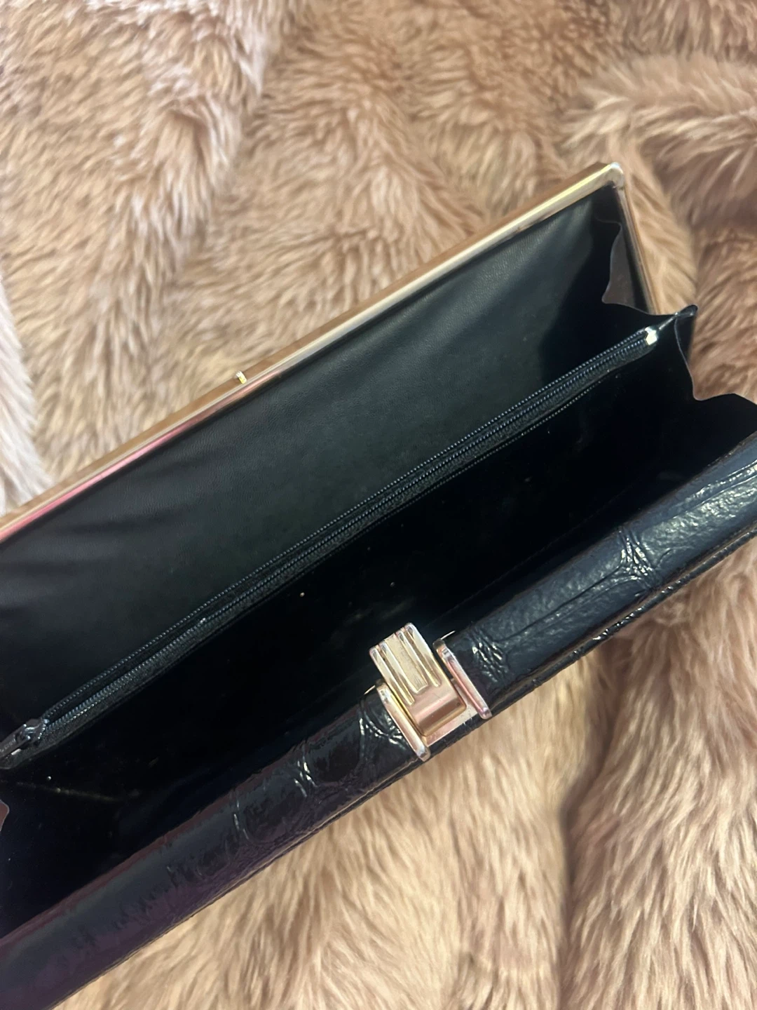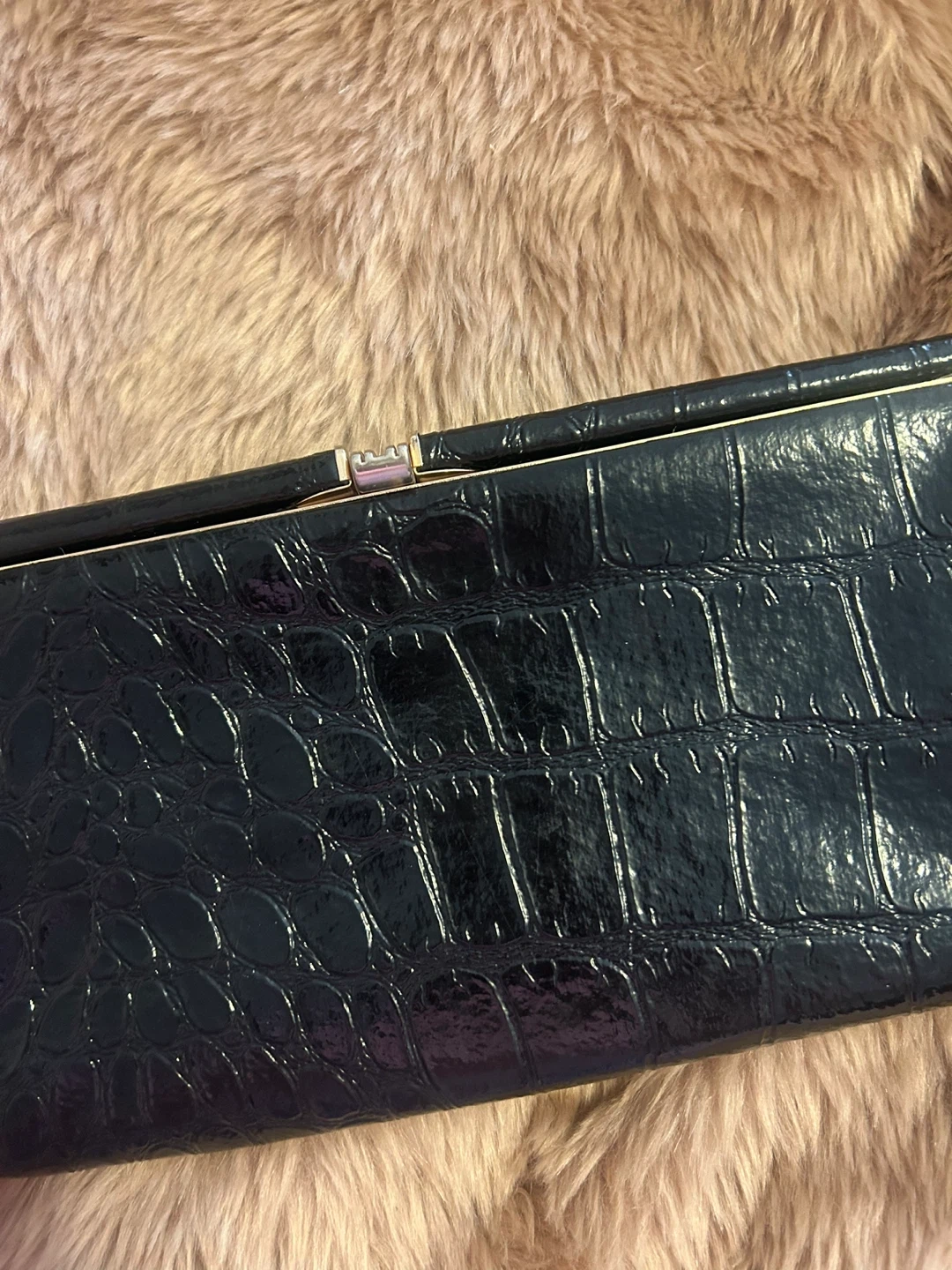 BLACK SHINY CROC-EMBOSSED LEATHER CLUTCH HANDBAG