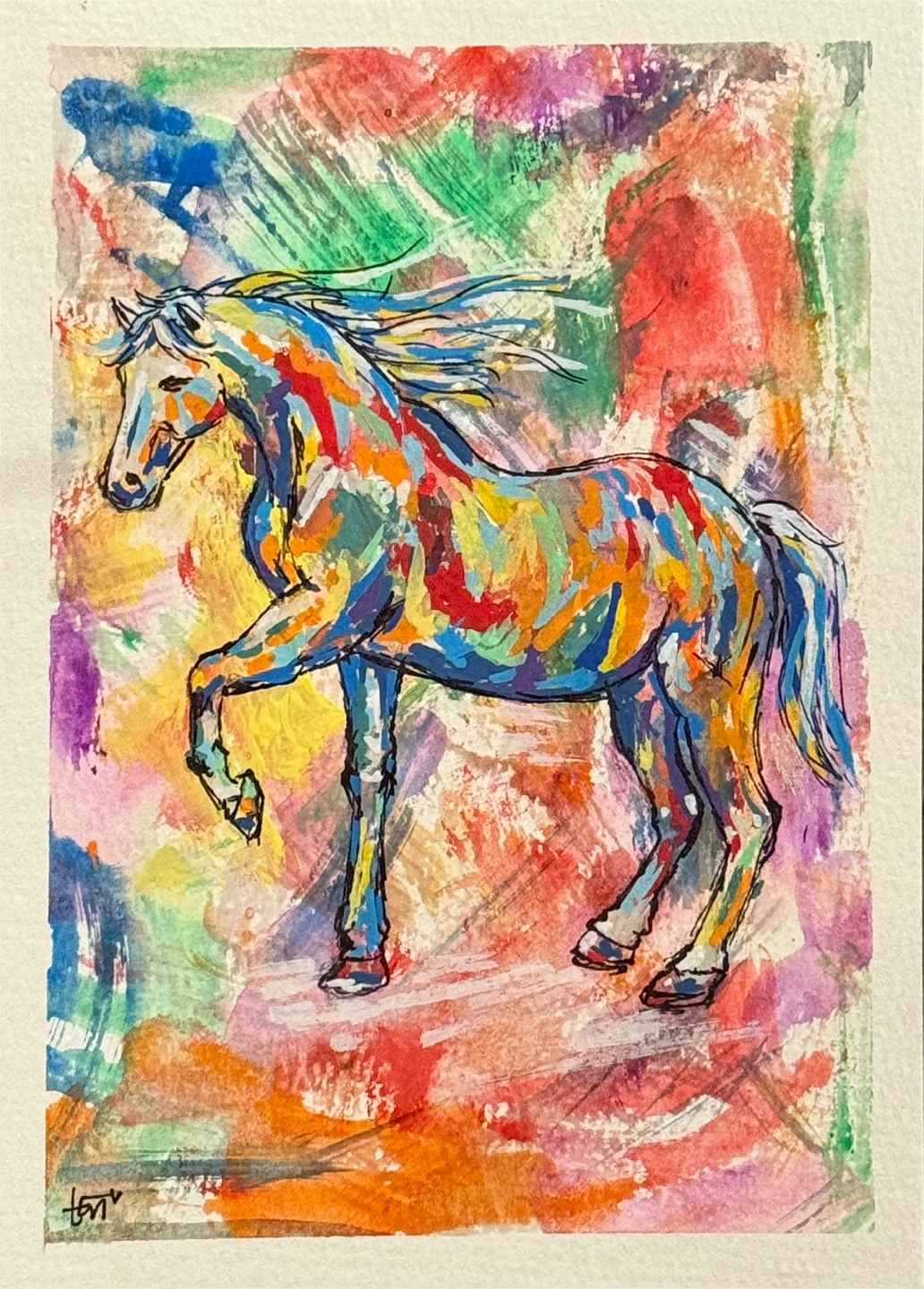 Mixed Media (Gouache, Acrylic & Ink) painting of an abstract horse on 5” X 7” 300gsm watercolour paper. The expressive brushstrokes and splashes of bright colours create a dynamic, artistic piece. This is one of a kind in its series of colourful horses. Entitled “Aurora” No. 1 in the series of Horses of Different Colours. This not a print, Signed by the artist at the bottom left. Please note the piece comes unframed. They can be framed and displayed to add a pop of colour to any space. Also, makes a perfect gift for art lovers and collectors and to celebrate the year of the horse!