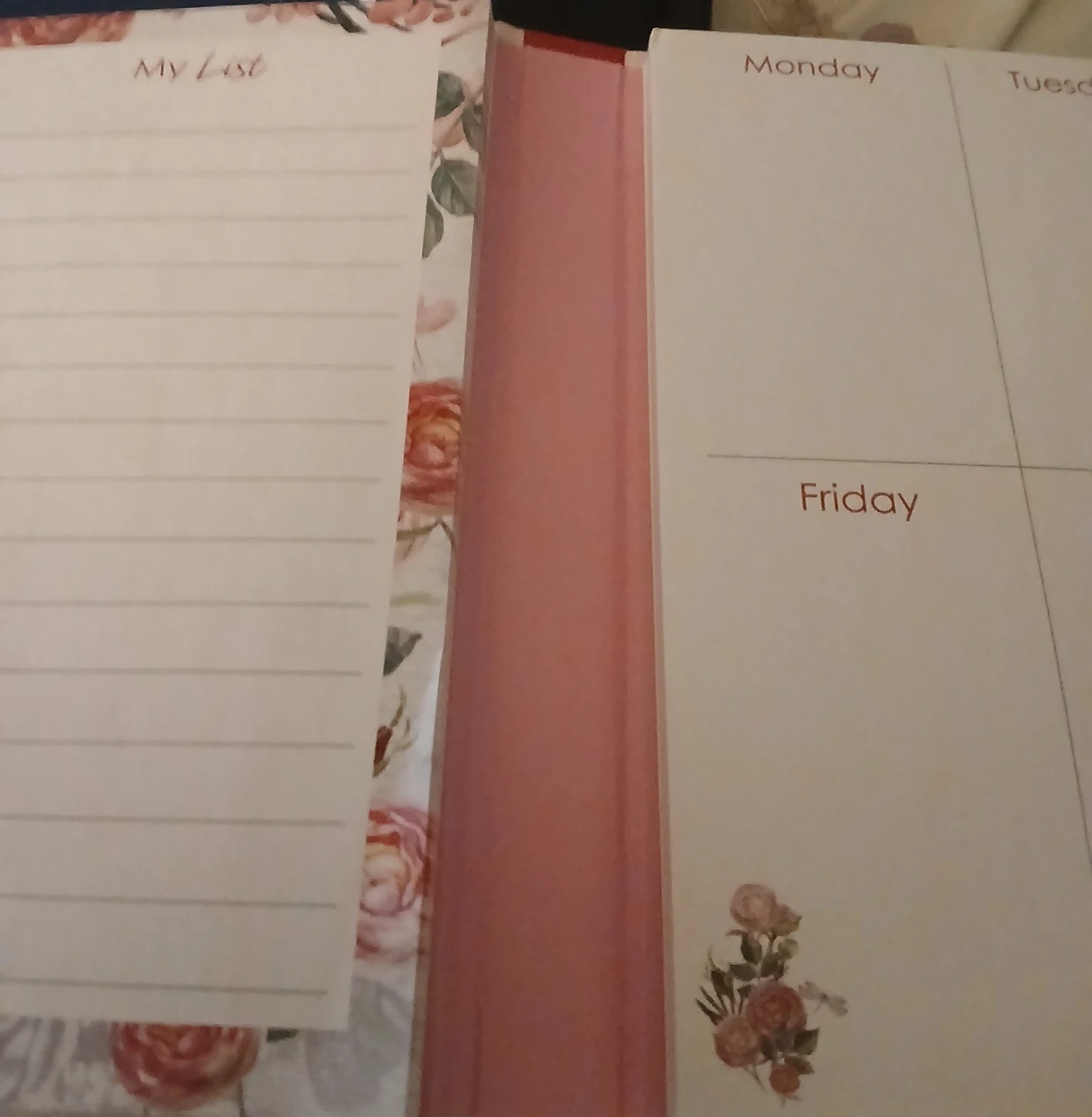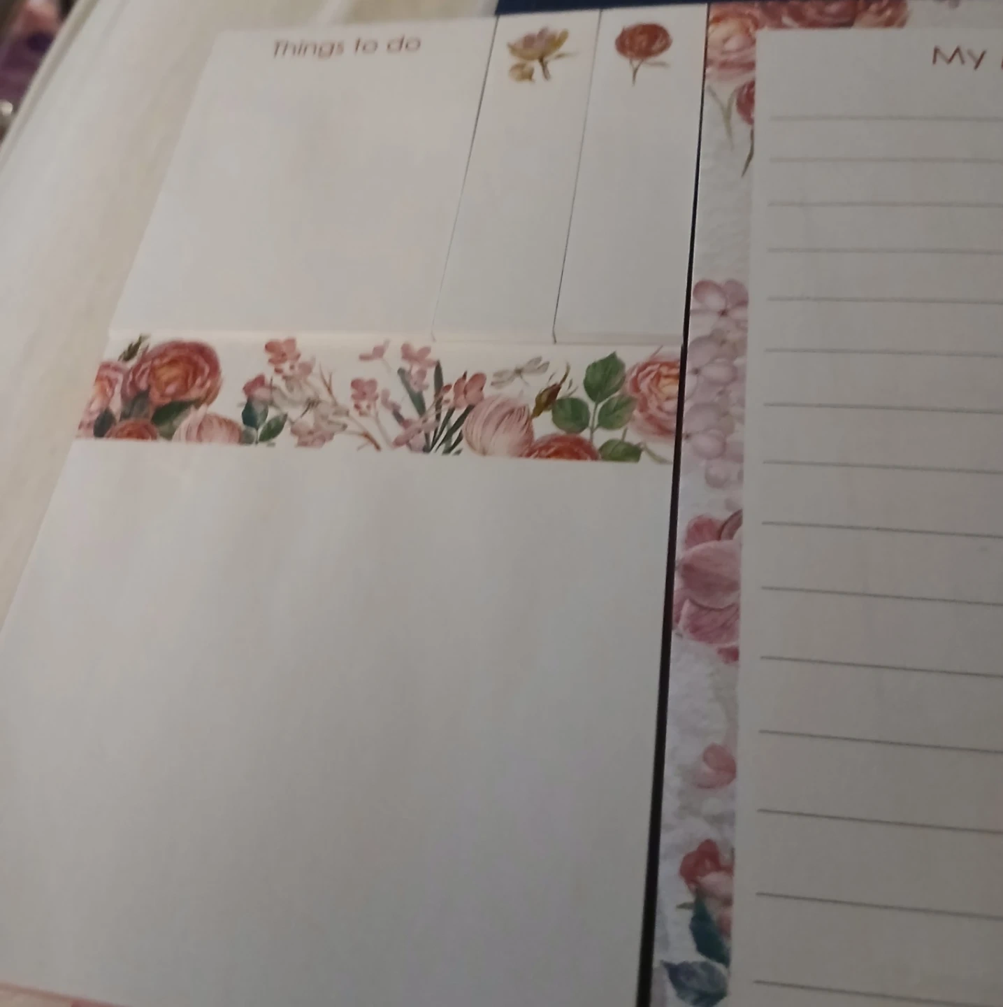This weekly organiser features a floral design. It includes sticky notes, a memo pad, and a weekly note pad. It's perfect for keeping track of your busy schedule!