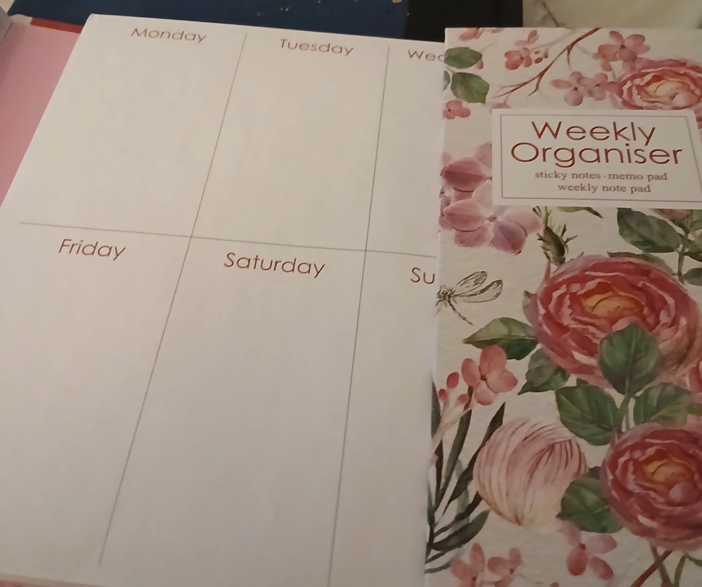 This weekly organiser features a floral design. It includes sticky notes, a memo pad, and a weekly note pad. It's perfect for keeping track of your busy schedule!