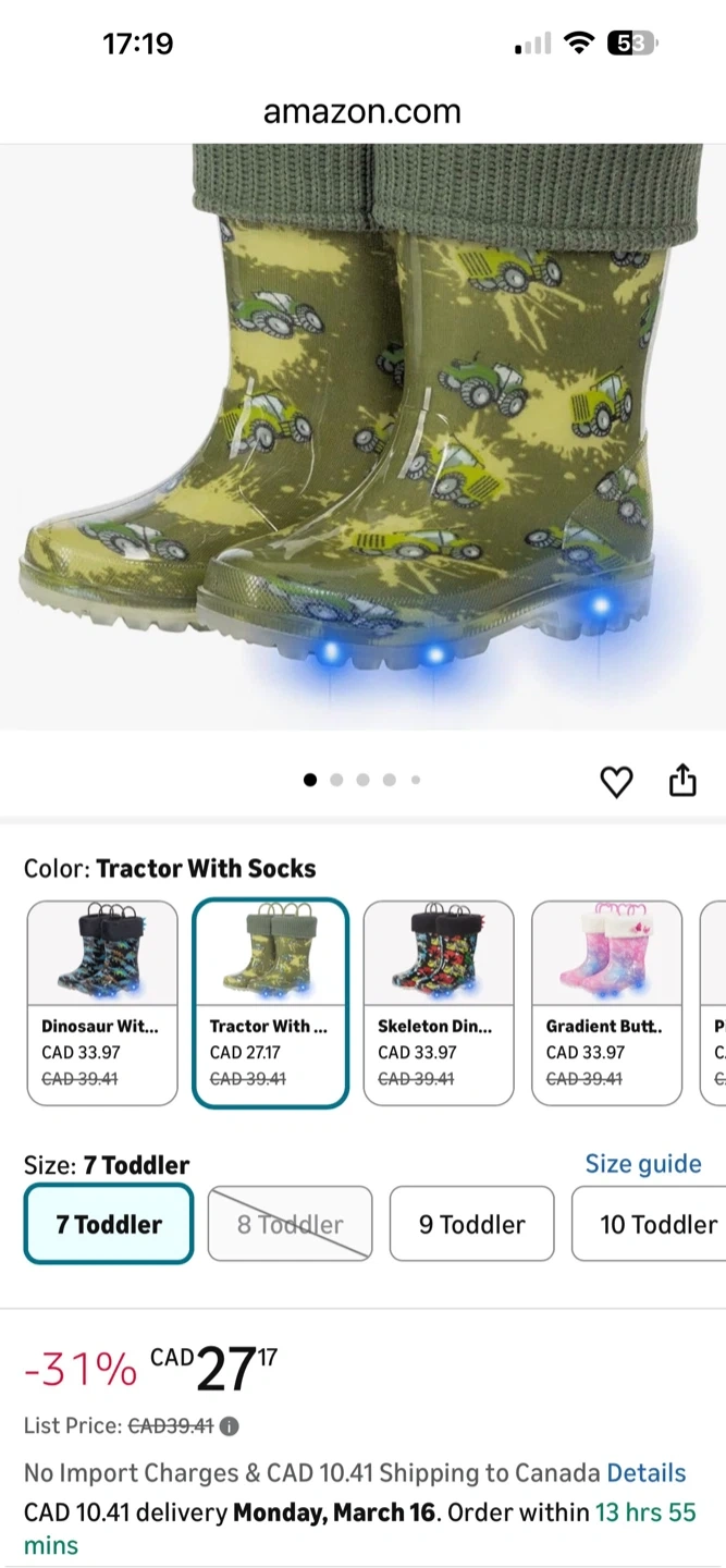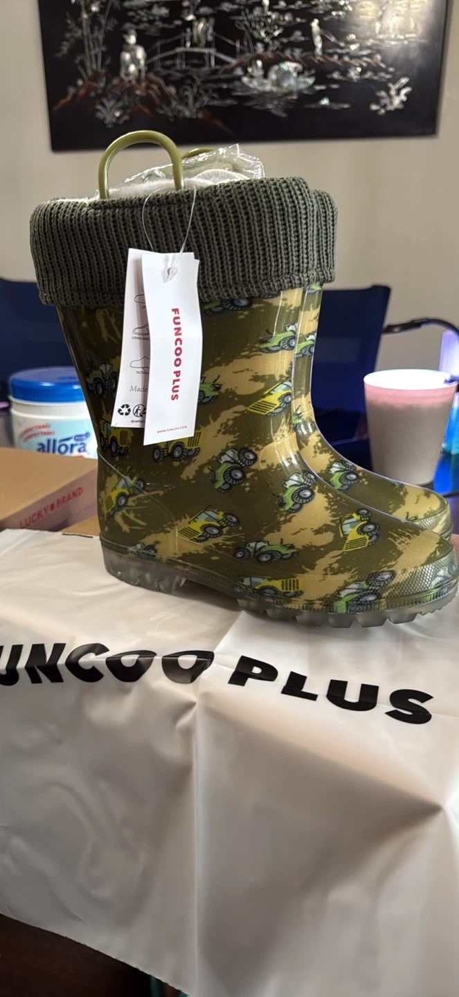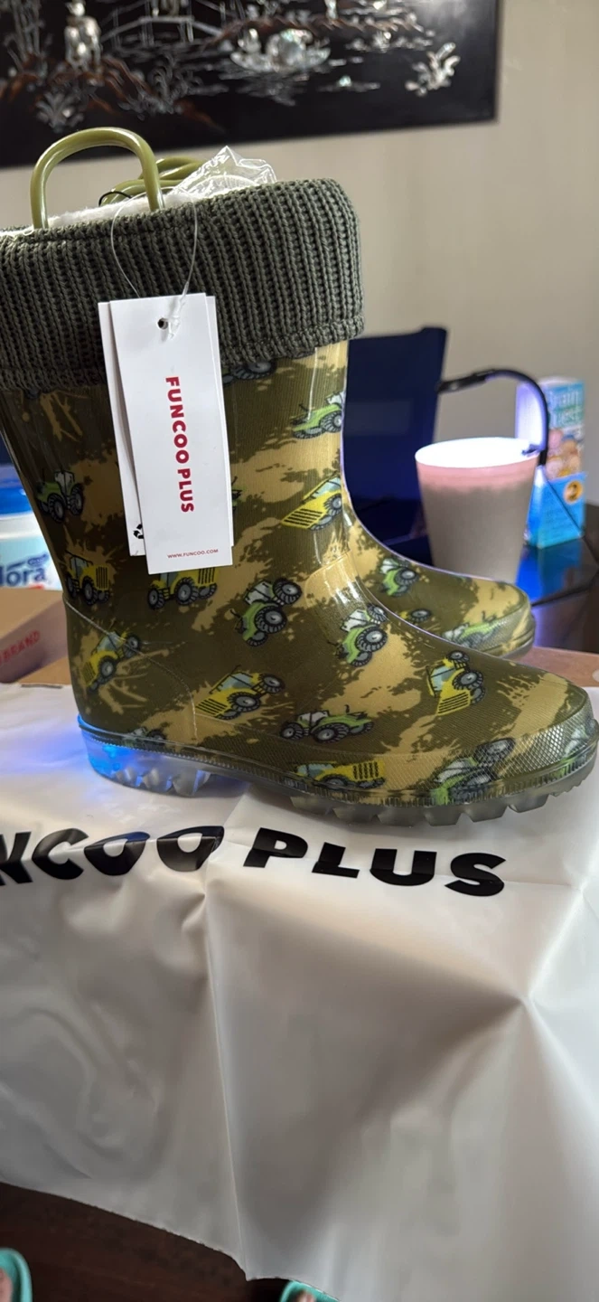 FUNCOO PLUS kids rain boots with tractor print and knit sock tops. These boots have light-up soles for fun! Size 2 toddler. Rubber material. 33cm longer