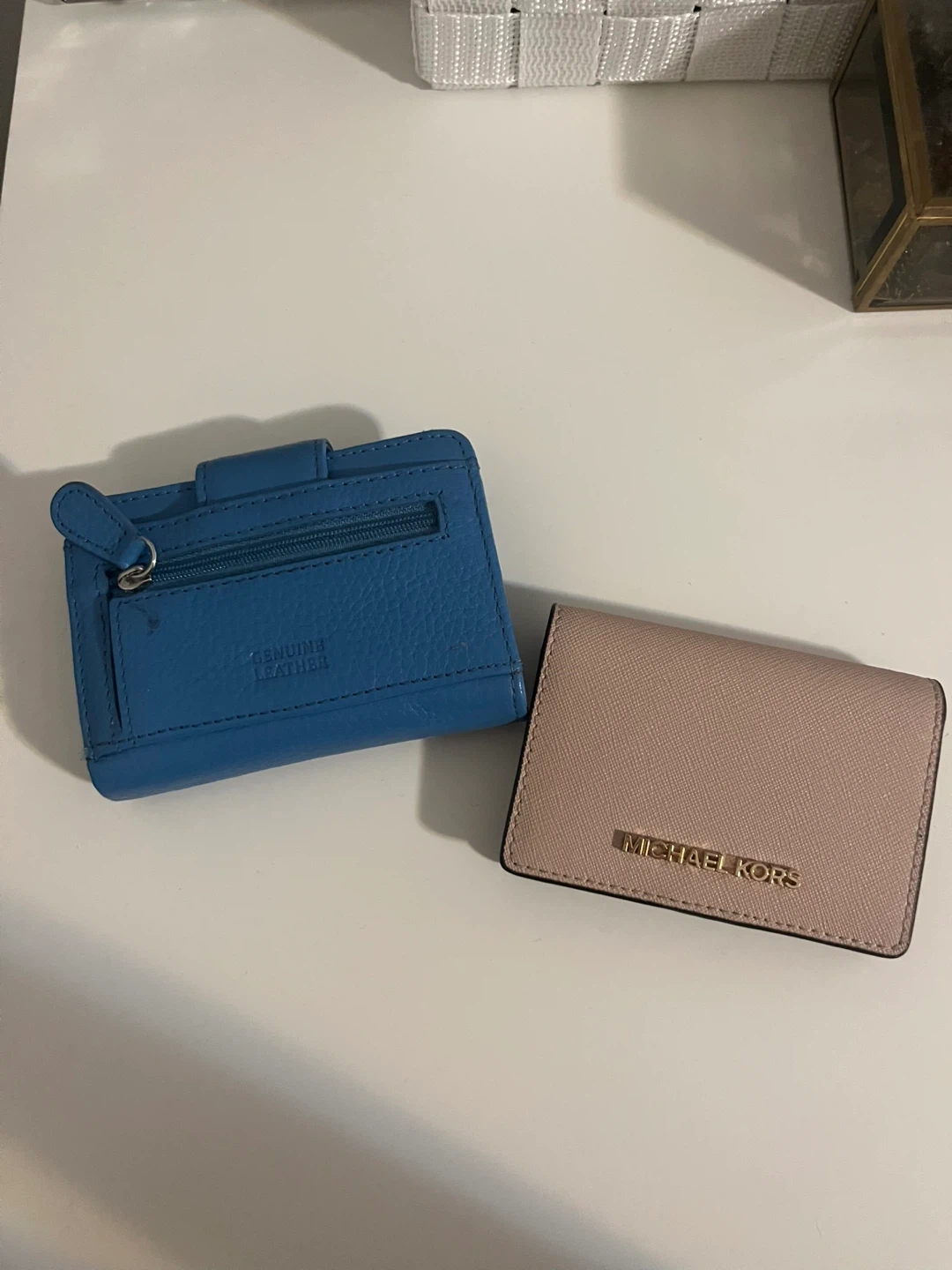 Selling two card holders! One is a light pink Michael Kors card holder, and the other is a blue genuine leather card holder. Both are in great condition and perfect for carrying your essential cards
