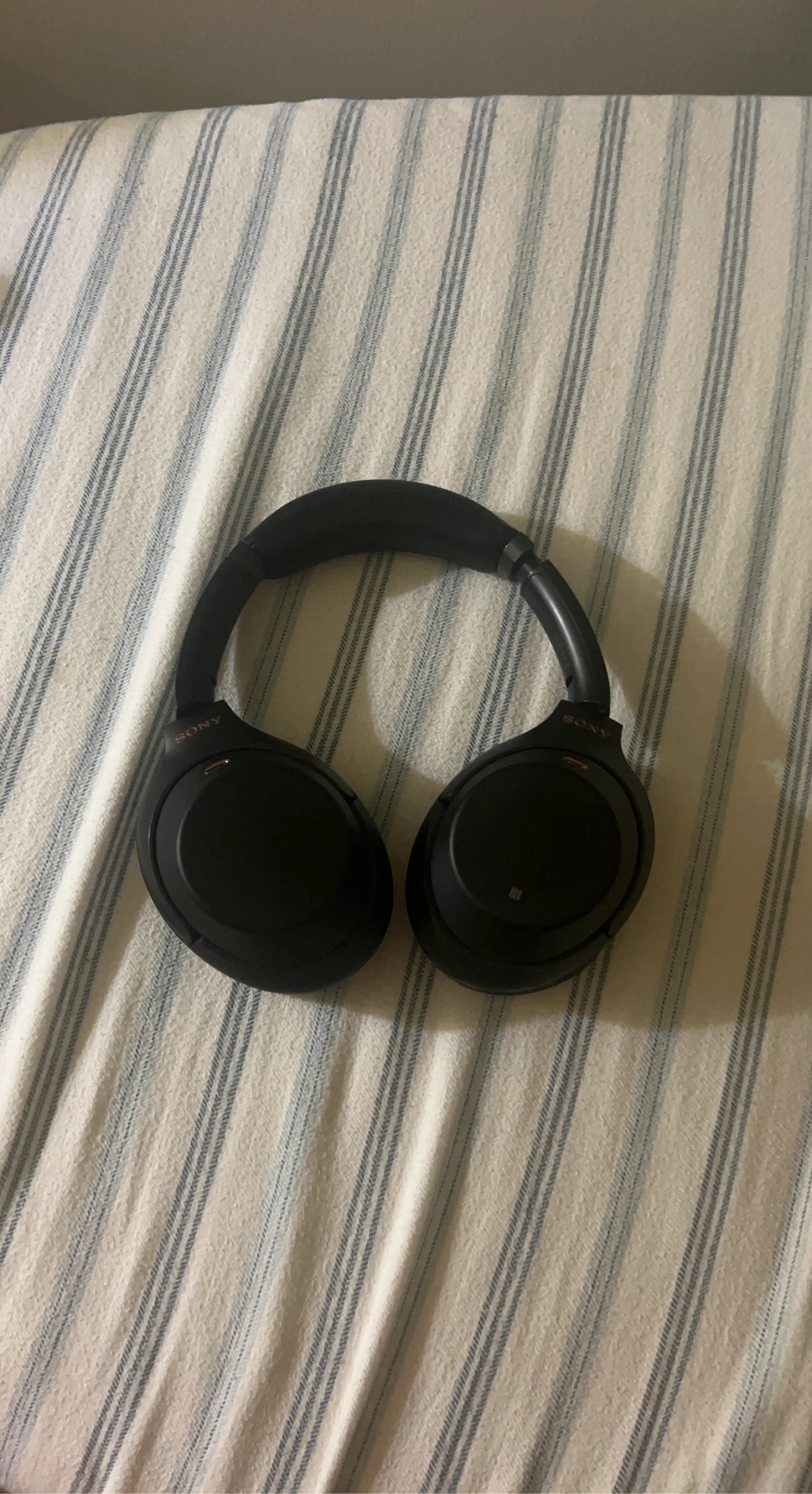 Selling a pair of black Sony WH-1000XM3 noise-cancelling headphones. They're wireless and come with a USB-C charging cable. These headphones are known for their excellent sound quality and comfort.
