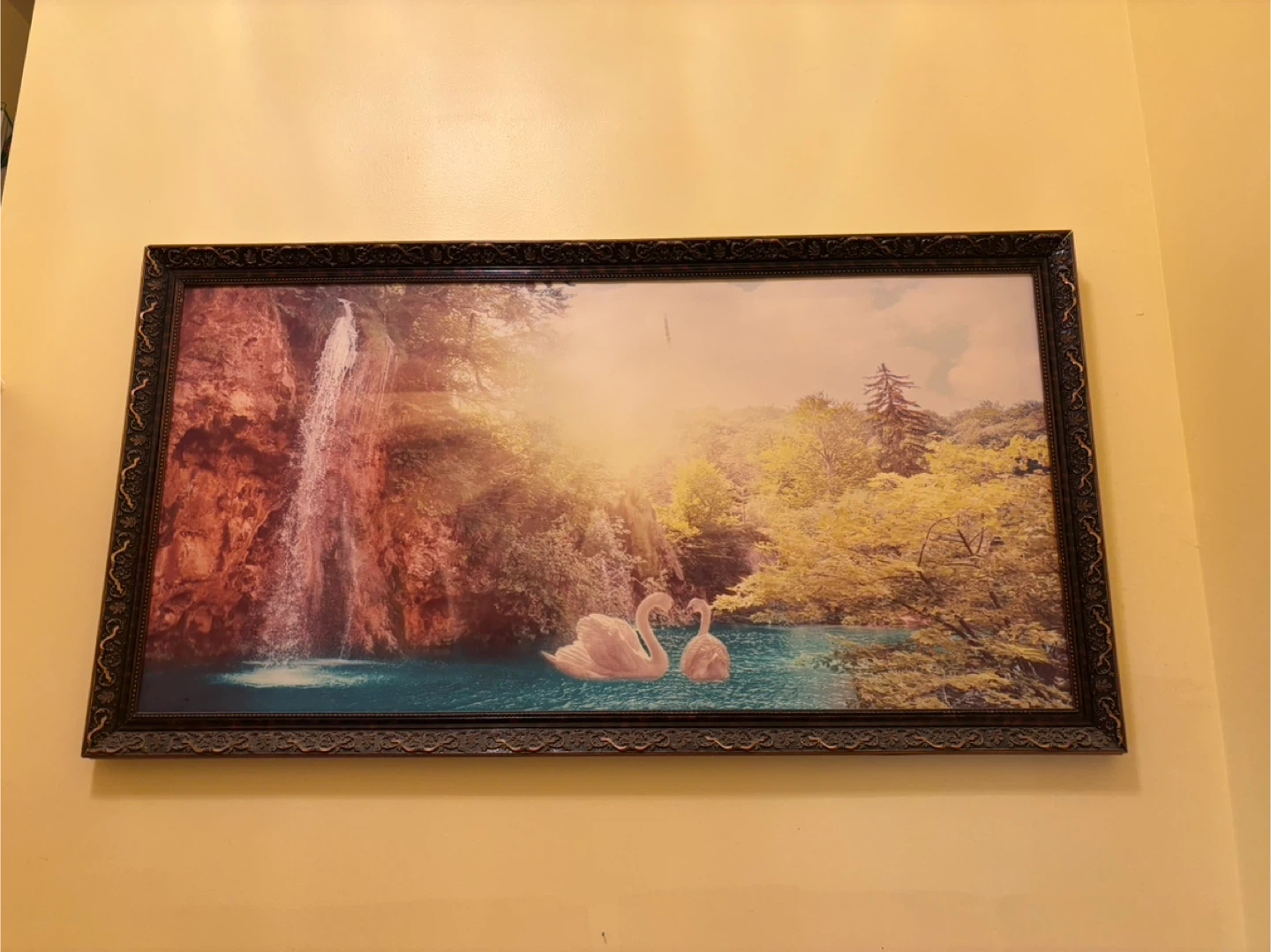 This framed art piece depicts a serene landscape with a waterfall and two swans. It's set in a decorative dark frame. Bright, warm lighting enhances the natural scene.