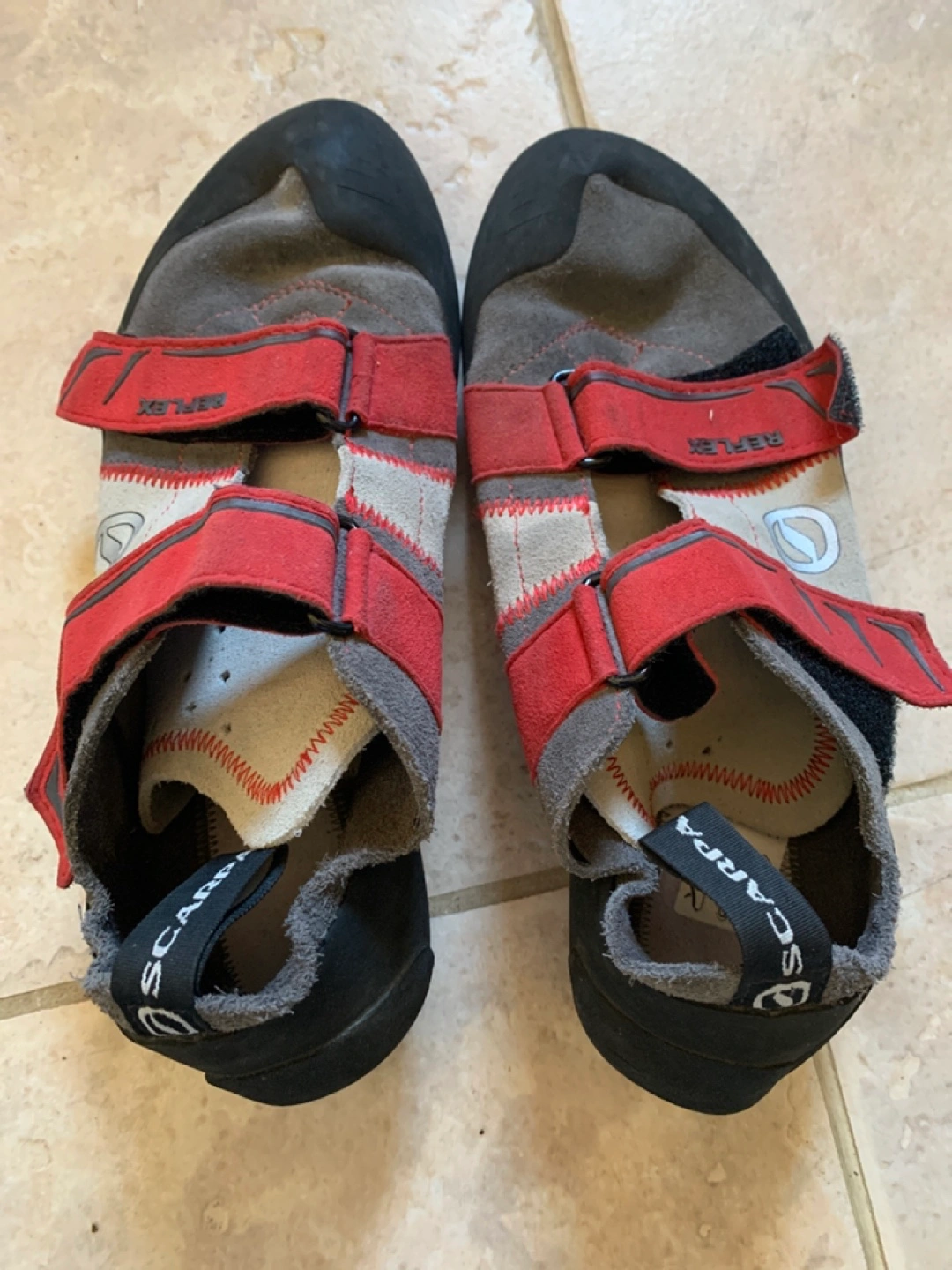 Never used Scarpa Reflex climbing shoes. Grey and red. Velcro closures. Size EU 43 1/2, UK 9 1/2, US men's 10 1/2.