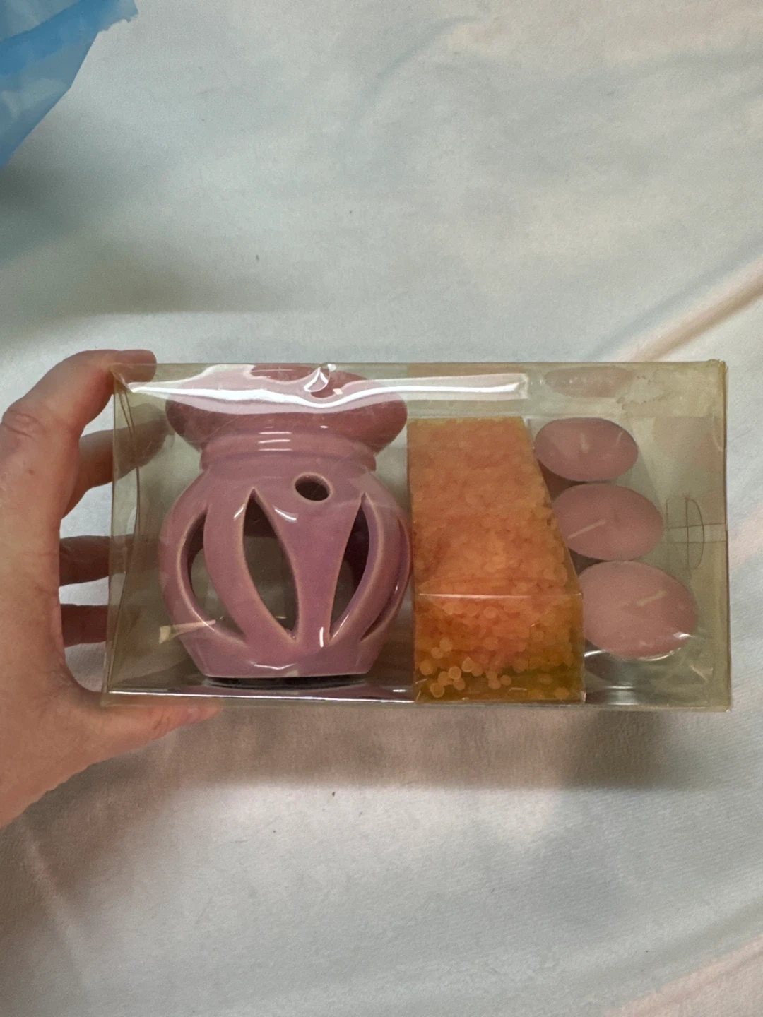 This set includes a pink ceramic oil burner with an openwork design. It also comes with a container of scented beads and four pink tealight candles. It's perfect for creating a relaxing ambiance in your home.