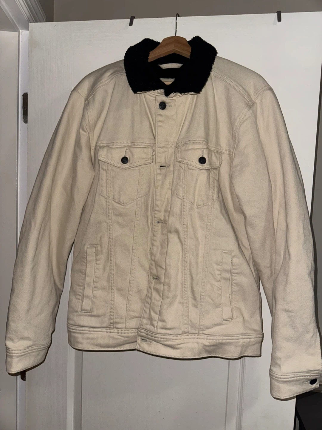 Very lightly worn Hollister denim trucker jacket in size large, featuring a cozy black sherpa collar. This jacket is in good condition and ready to add a touch of cool to your wardrobe.